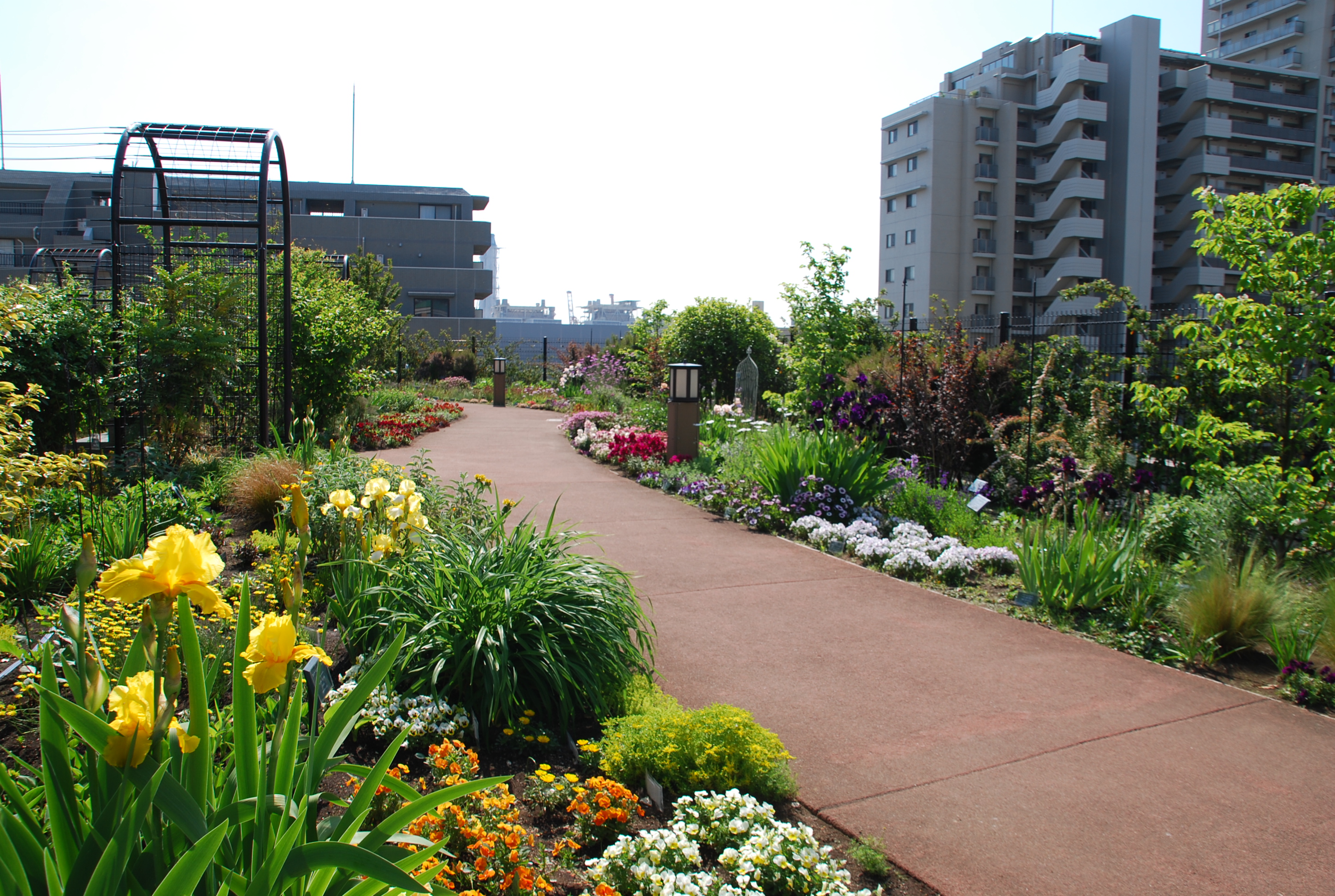 ポンプ場の上に設置された屋上庭園には四季折々の草花が楽しめる花壇と芝生広場があり、本格的なイングリッシュガーデンがもうけられている。