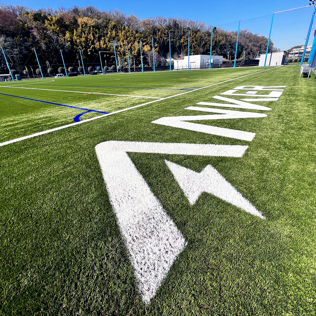 サッカー場は、クッション性に優れたロングパイル人工芝舗装を施工。充填材は、マイクロプラスチックにつながるゴムチップを使用せず、自然素材を使用。Anker フィールドとNebula フィールドには白色の人工芝でロゴを設けた。