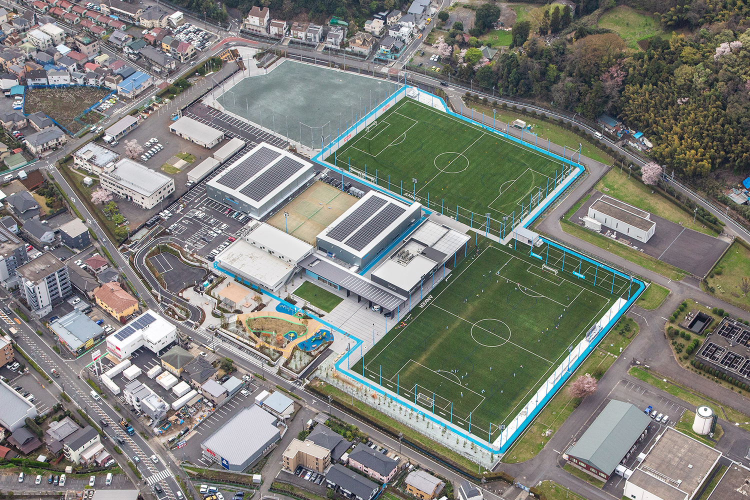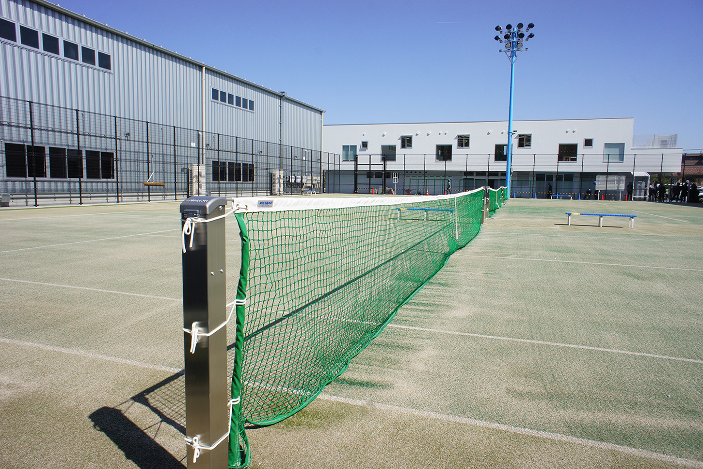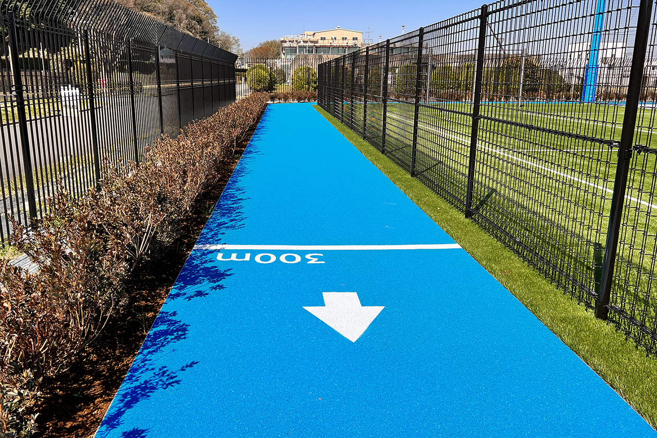 当社では、Anker フィールドとNebula フィールドではロングパイル人工芝舗装、防球ネットと照明工事などを施工した。また、Anker フィールドに隣接するマルチスペースやシューティングボード、観覧席等も整備。さらに、Soundcore アリーナでは床及び防球ネット工事、Eufy インドアテニスコートでは砂入り人工芝と室内ネット工事、Eufy アウトドアテニスコートでは砂入り人工芝舗装と外周フェンス、照明工事などを施工。加えて、外周ジョギングコースとふれあい広場のカラーチップ舗装工事も施工した。