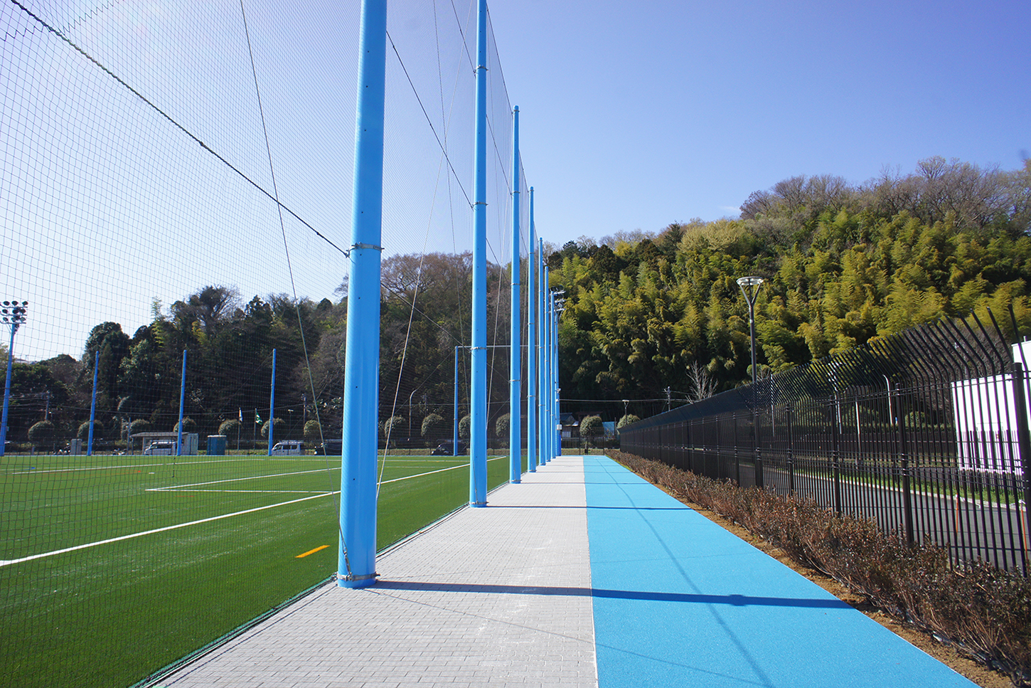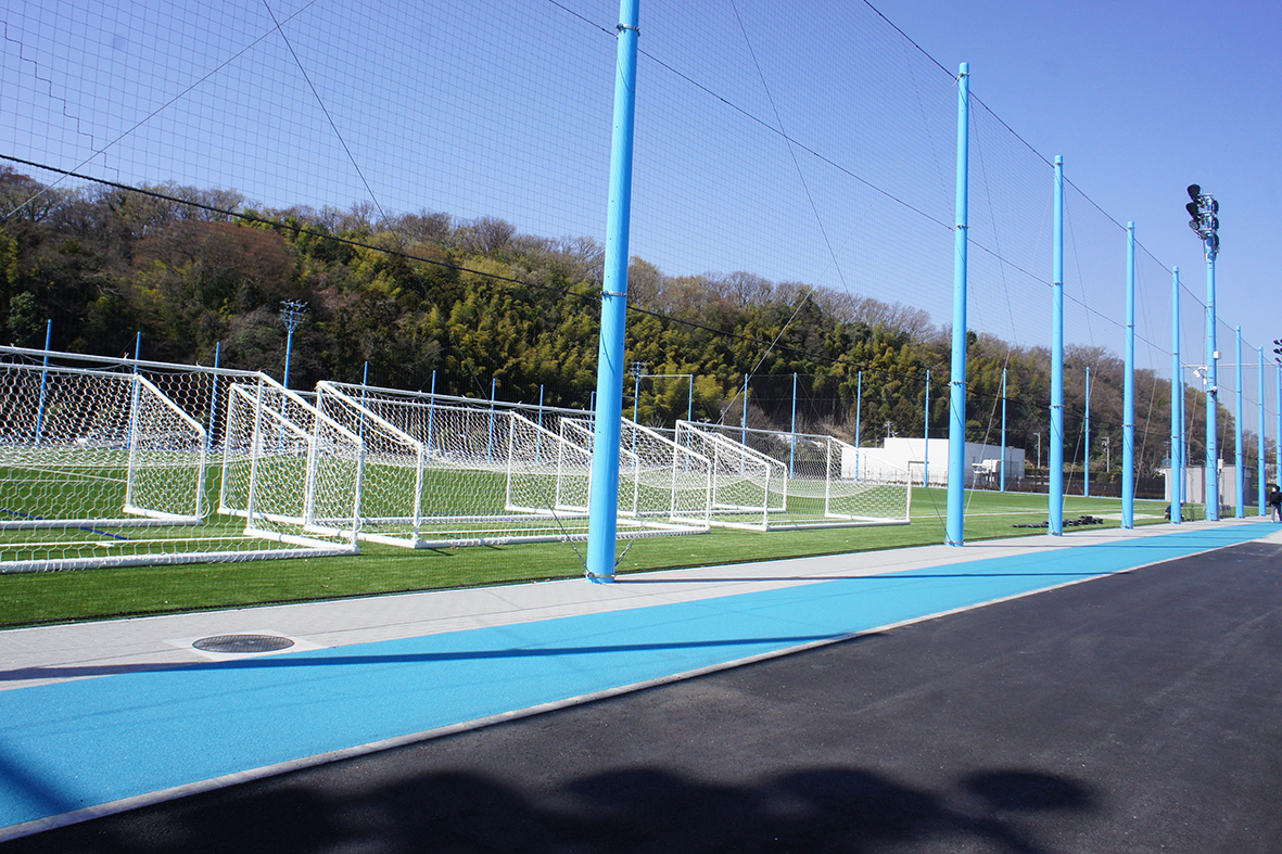 外周部の防球ネット及び照明柱とカラーチップ舗装は、クラブのイメージに合わせたライトブルーで整備。ジョギング走路に使用したカラーチップは、高発色・高強度が魅力のTPVチップ。白色塗料を吹付け、距離をマーキングした。また、遊具エリアは、衝撃吸収性を高めた舗装構成によって施工。