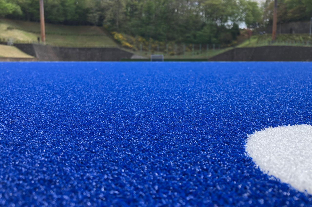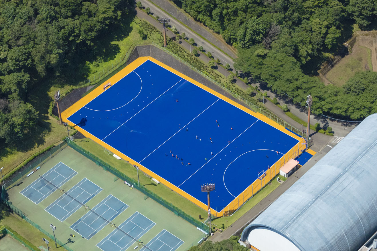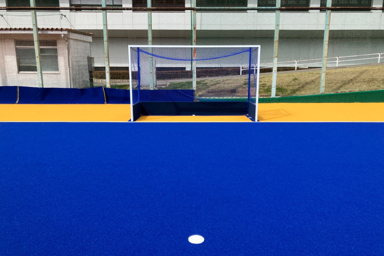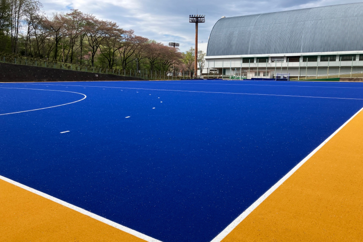 採用されている人工芝は、国際ホッケー連盟(FIH)グローバル基準認定品のウォーターベースタイプ。足腰の負担を軽減するアンダ―パットを使用し、安全性の高いフィールドに仕上げた。カラーはブルーをメインカラーに、フィールドの外はオレンジの人工芝で整備。