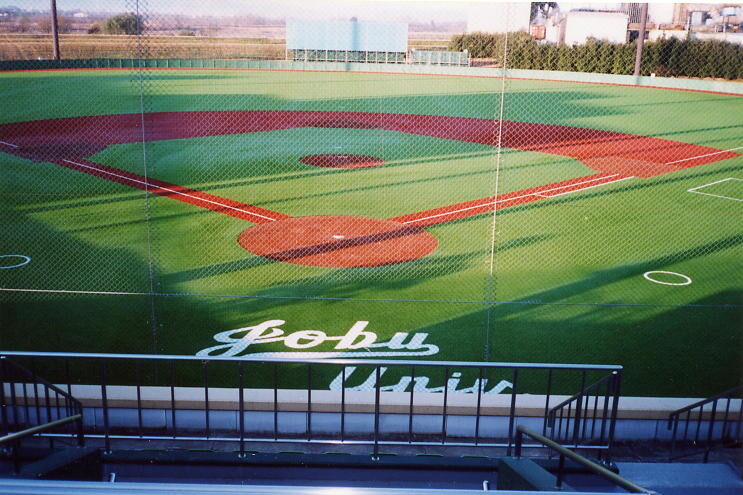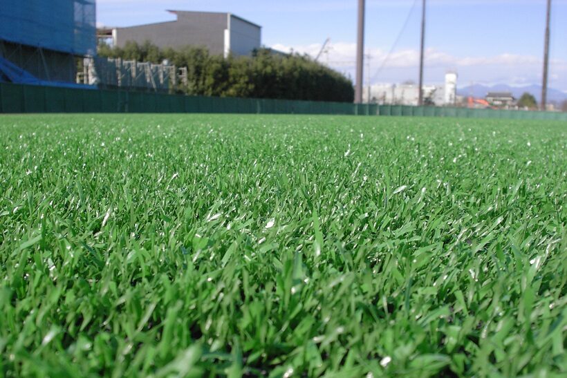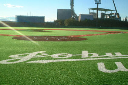 群馬県伊勢崎市にある上武大学野球場。野球場全面をロングパイル人工芝舗装に整備。