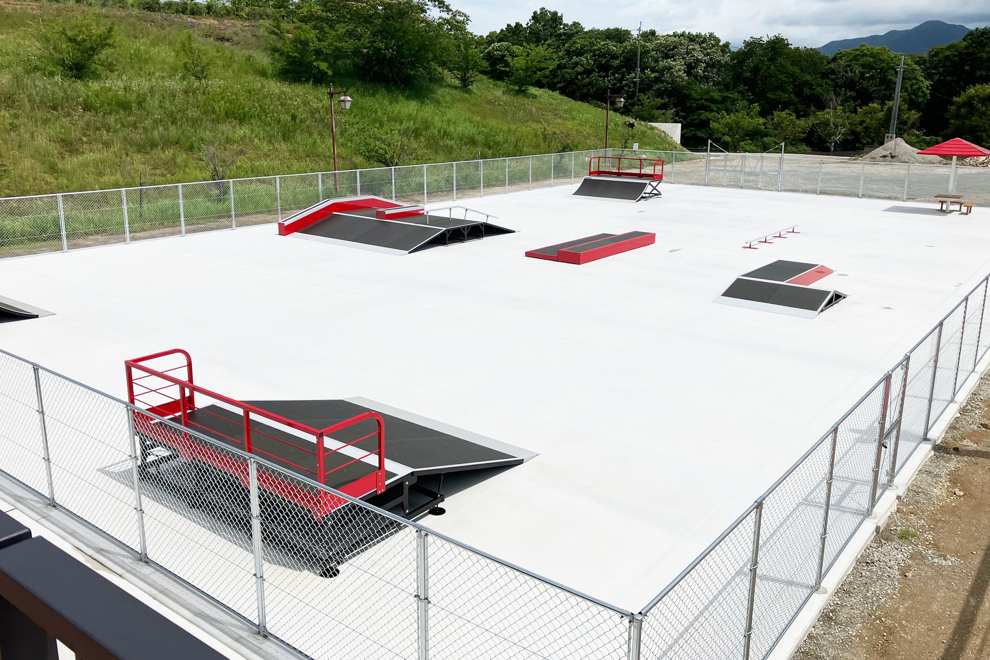 スケートパークセクション、シェルター、コンクリート舗装、フェンスなど