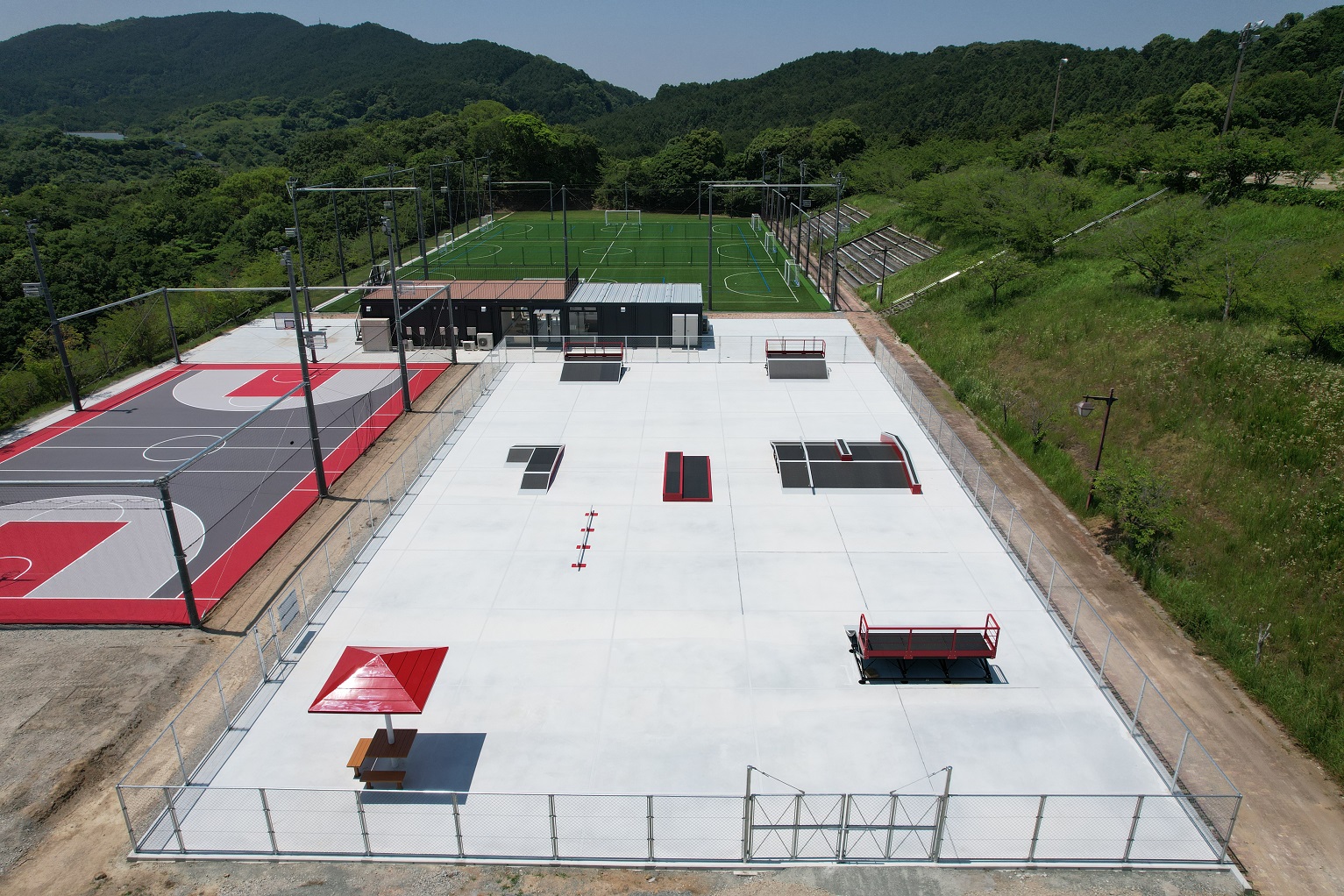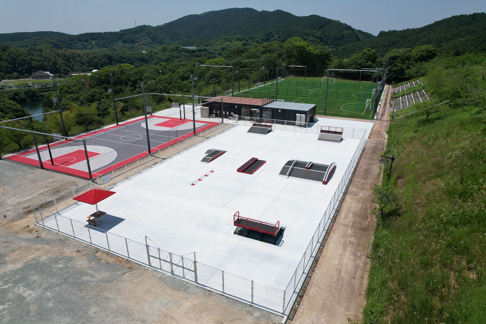 2023年、福岡県福智町の新たなスポーツ拠点として誕生した金田ふれあいスポーツ公園。フットサルコートとスケートパーク、3×3コートで構成されている。