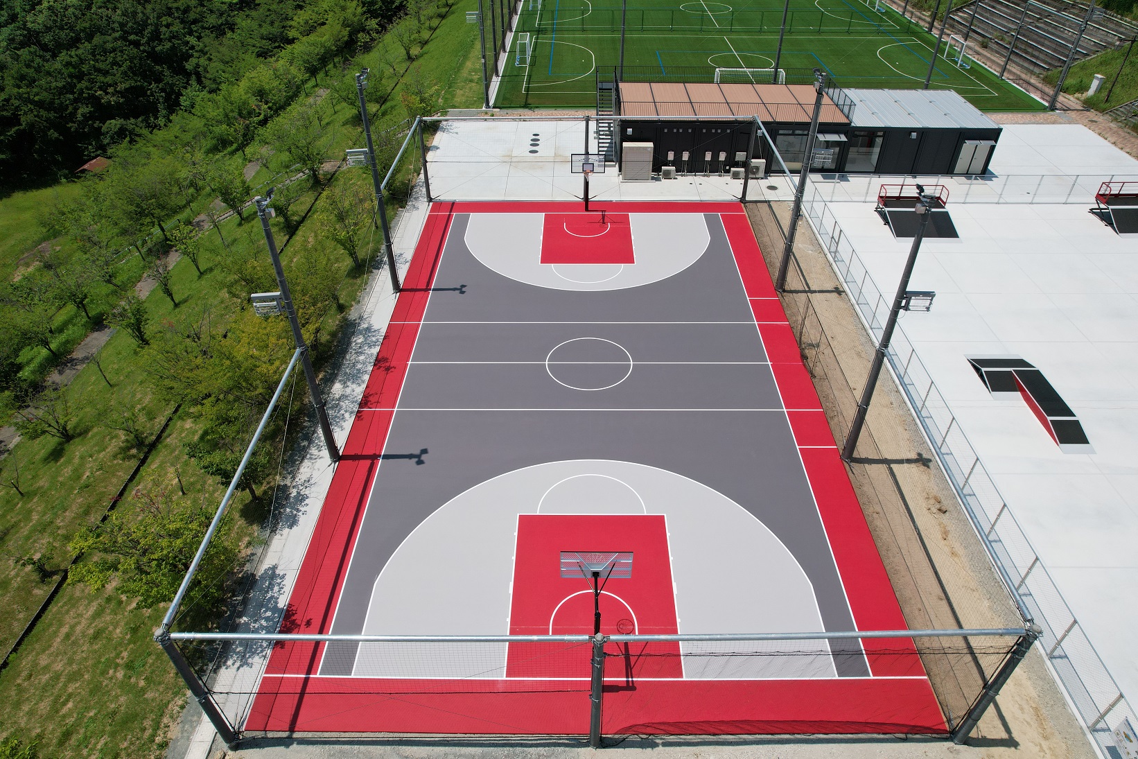 3×3コートは対面式で、バスケットコートとしても使用できます。サーフェイスはスムース仕上げの複合弾性舗装『レオタンαエンボスRタイプ』。カラーは特注色のレッド、グレーの濃淡のカラーコーディネーションです。