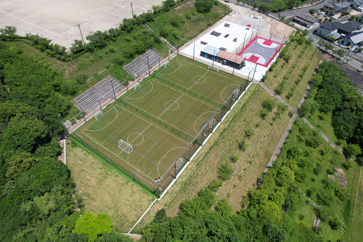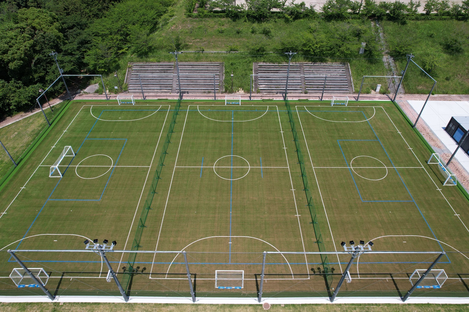 フットサル場の新設工事。衝撃吸収性・耐久性に優れたロングパイル人工芝舗装を施工しました。フットサルコート3面分と少年サッカー(ソサイチ)1面がレイアウトされています。