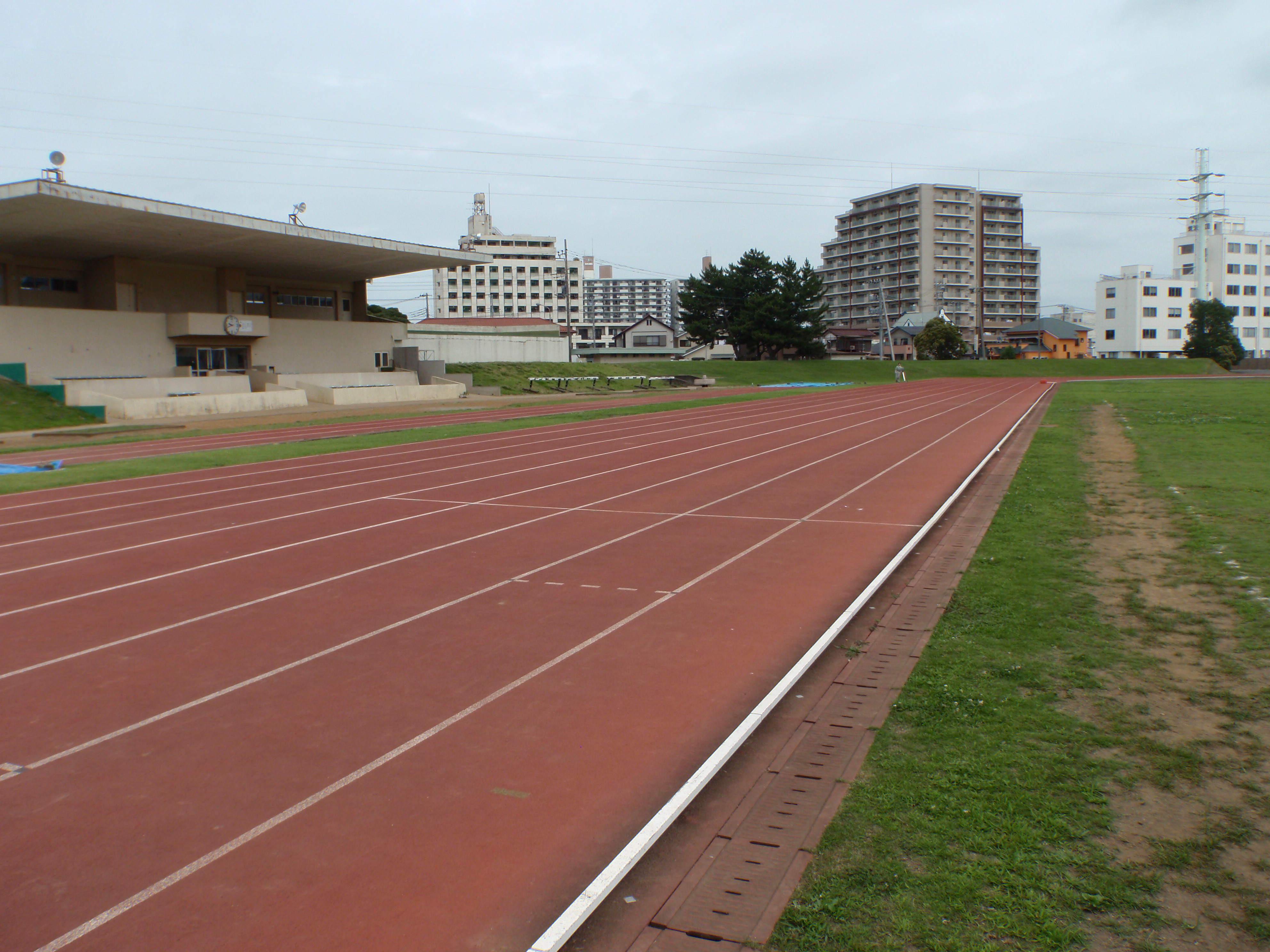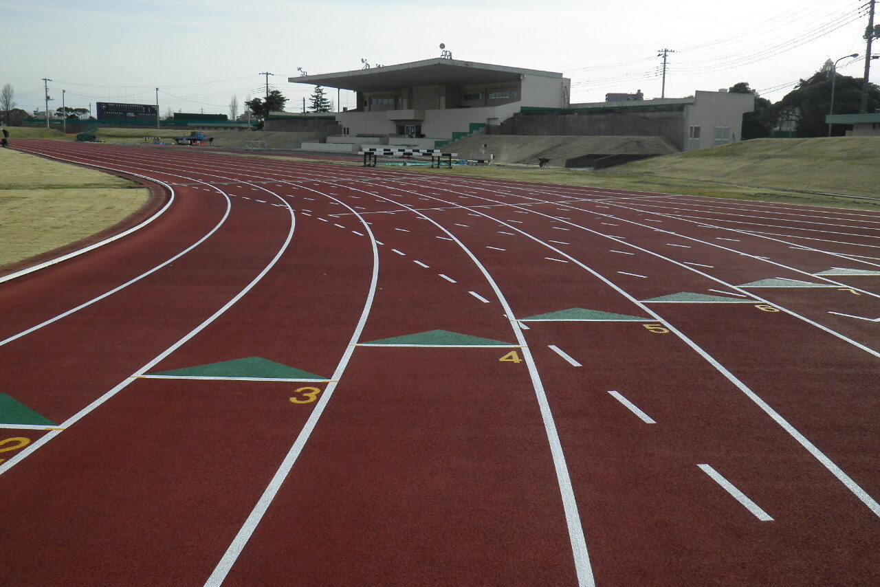 東日本大震災で被災したトラック走路を復旧。既存部はMOS洗浄工法でリニューアル。トラック舗装材は、ローラーエンボス仕上げの『レオタンαエンボス』。