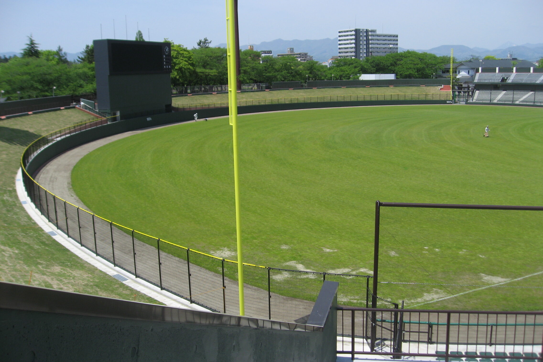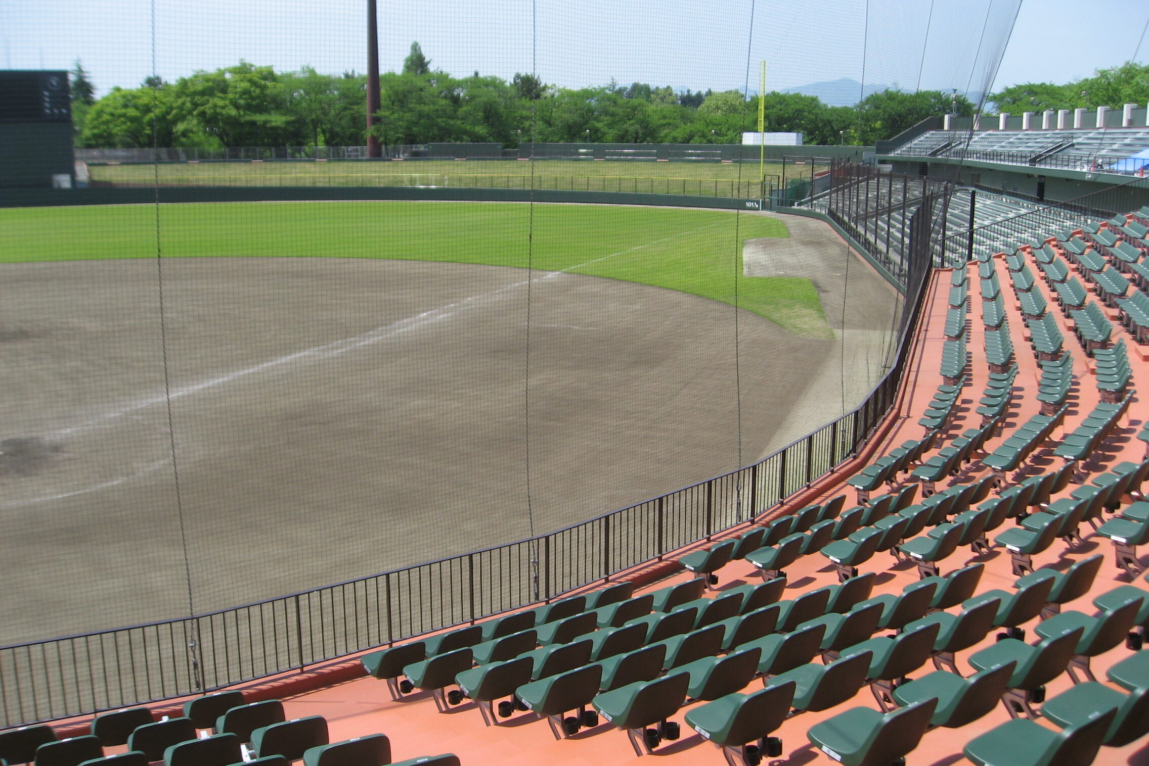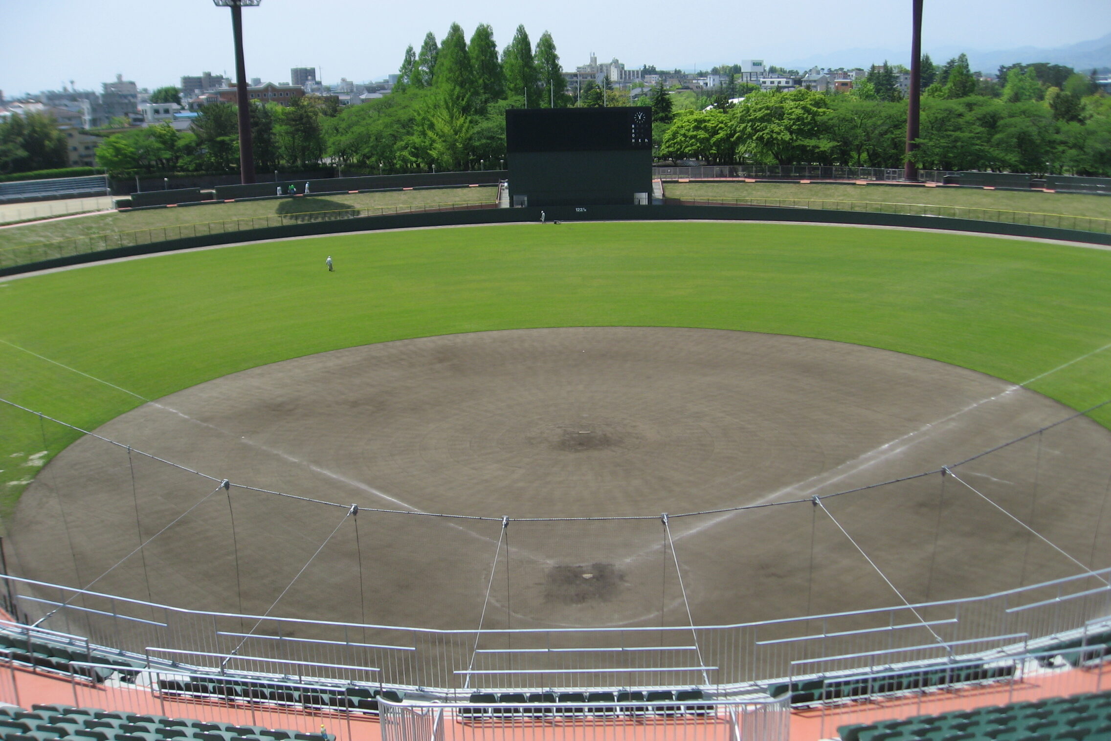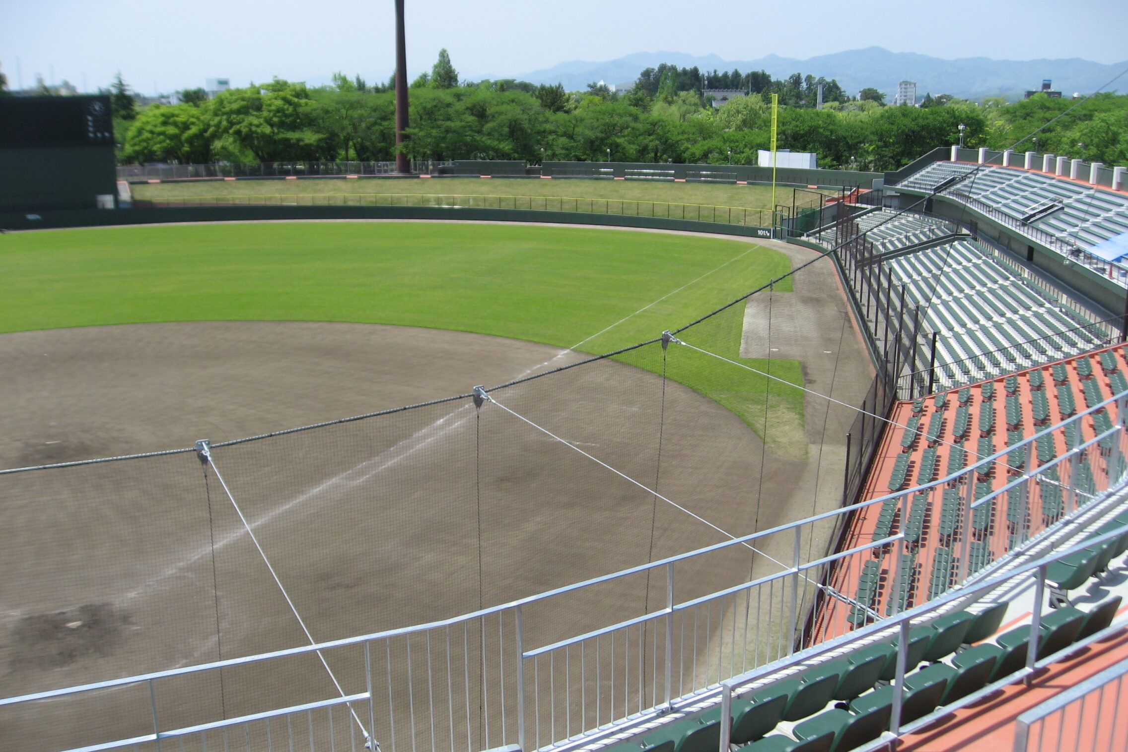 福島県郡山市にあるヨーク開成山スタジアム。内野はクレイ、外野は天然芝の標準的なレイアウト。プロ野球も開催可能なクオリティ。