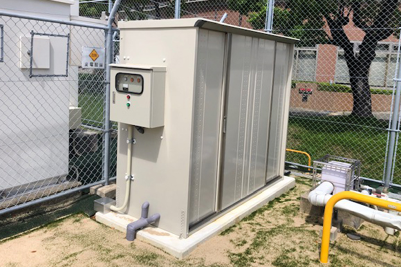 ゴム製カバー付きのミストノズルをサッカーピッチ外周に7mピッチで設置。ポンプ室は、家庭用の物置サイズ。
