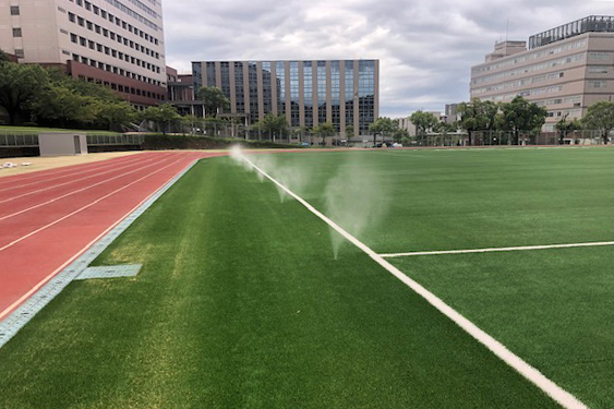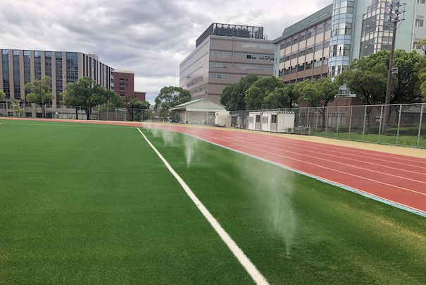 福岡県福岡市にある九州産業大学グラウンド。人工芝の張替え工事に伴い、グラウンド面からミストを噴霧する『フィールド冷却細霧システム』を整備しました。