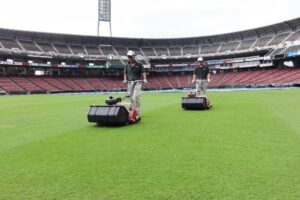 当社ではトラック・フィールドの施工と芝生管理に携わる。