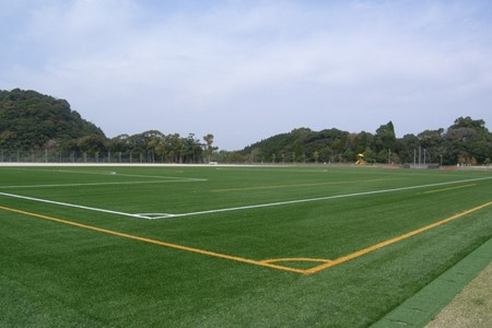 鹿児島県薩摩川内市にある丸山自然公園人工芝コート。アンダーパッド付きのロングパイル人工芝と砕石路盤により、ピッチの衝撃吸収性を高め、利用者に優しいピッチを整備。