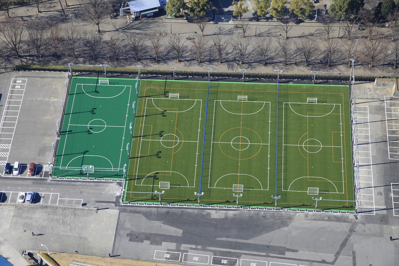 3面のコートの仕切をはずすことによって、8人制サッカーコートとして利用可能。すべてのコートに、省エネで長寿命、点灯・消灯が瞬時に可能なLED照明を使用したナイター設備を設置。
