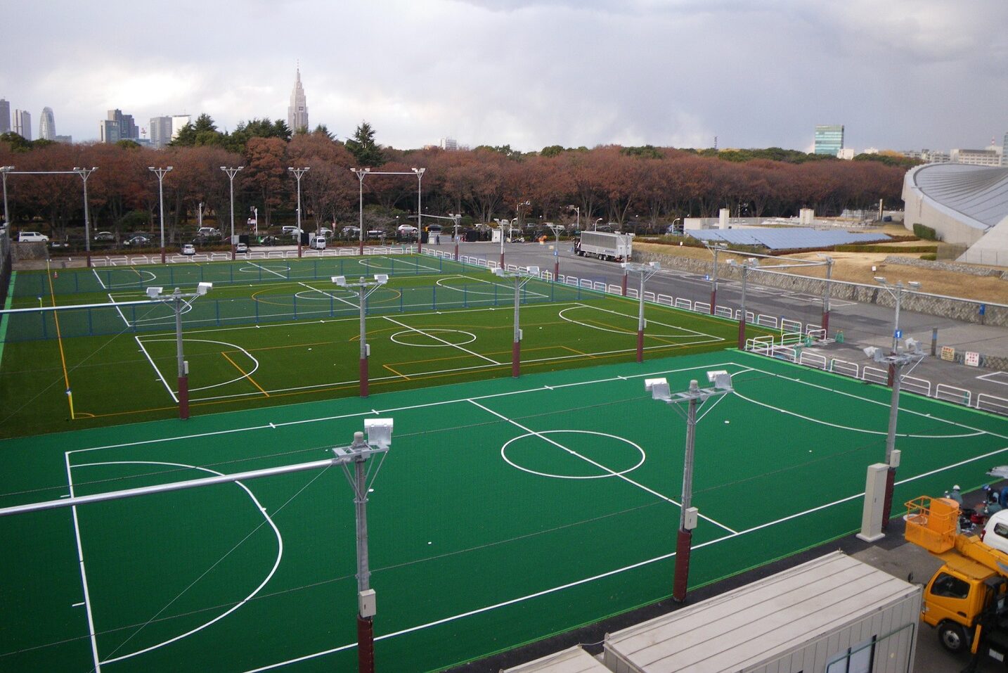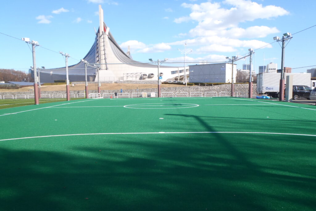これまでイベント会場として利用されてきたオリンピックプラザ跡地に完成したフットサルコートは、高密度人工芝が1面、充填物のないミドルパイル人工芝が3面で、いずれもアンダーパッドを敷設。