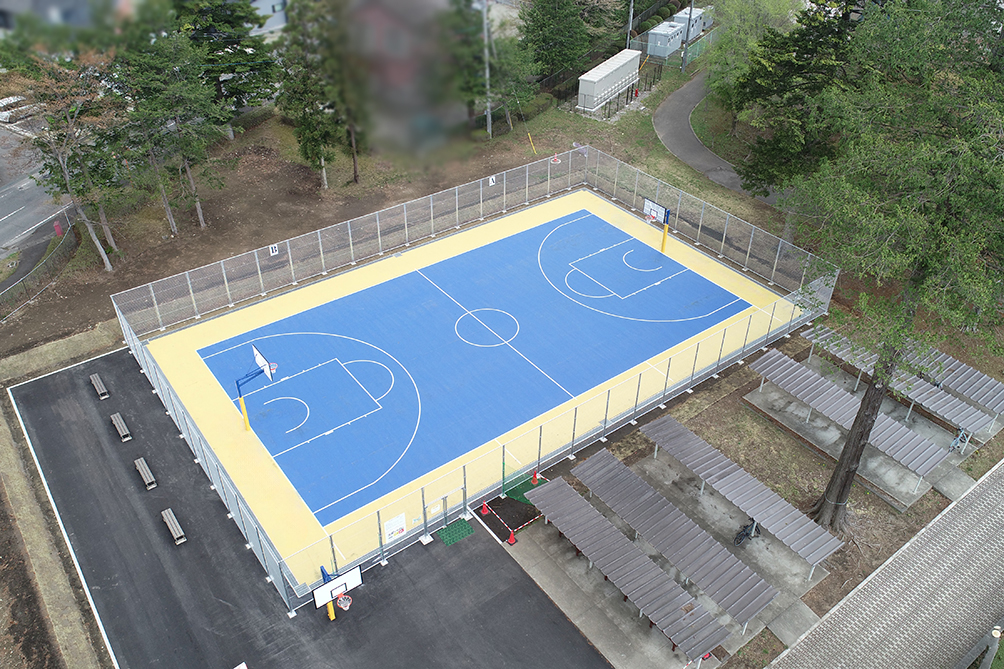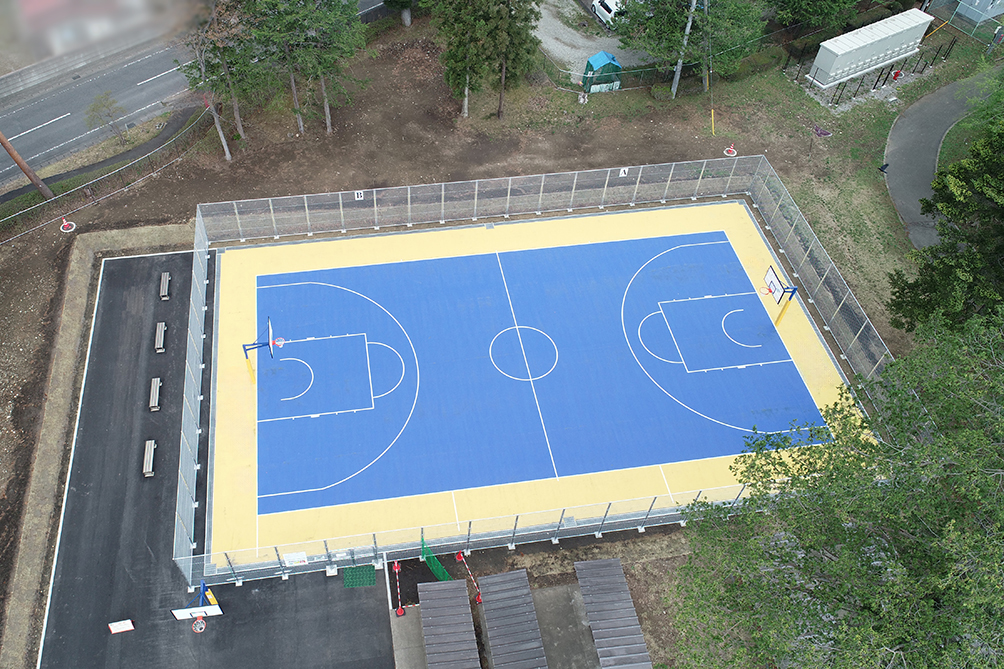 青×黄のカラーコーディネーションによりバスケットコート新設。舗装材は、耐久性と衝撃吸収性を有するアクリル舗装材『レオタンES』。ゴールの支柱は、防護マットを設置。