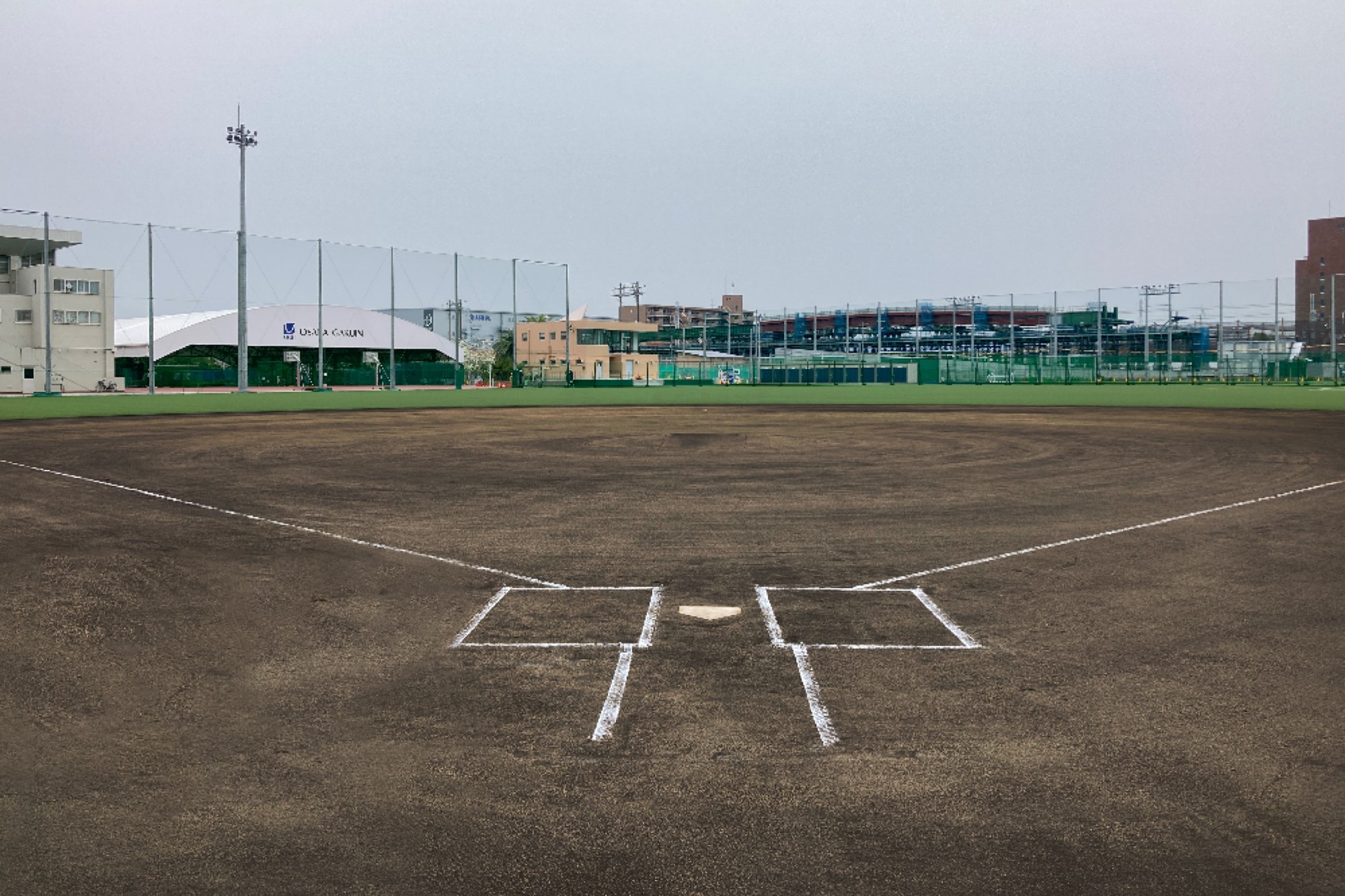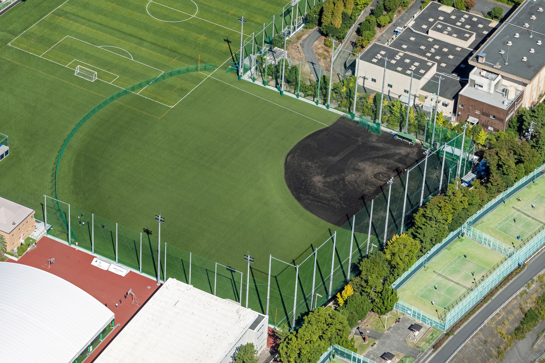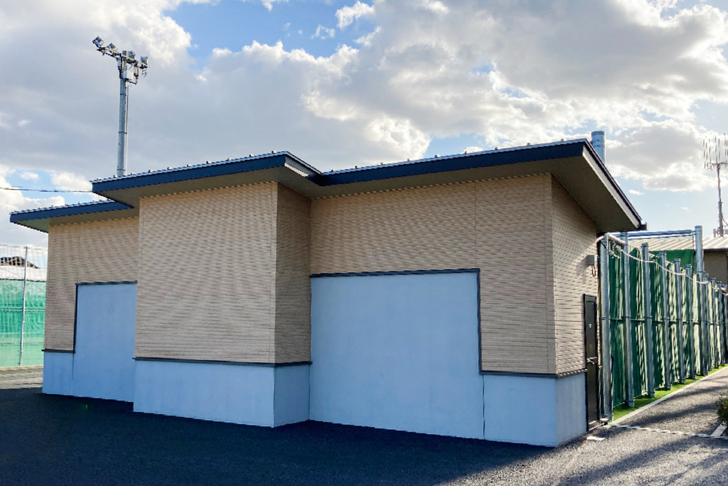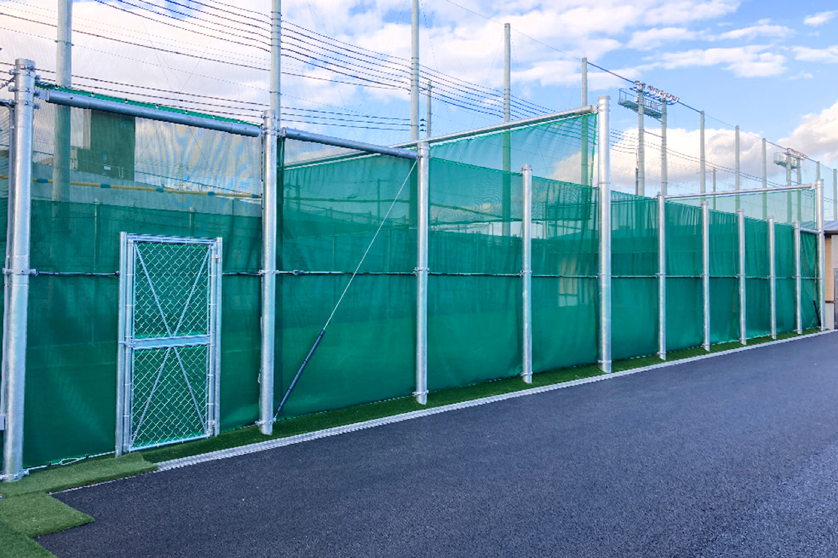 特に野球場の周りは、場外への飛球を防ぐため高さ25mの防球ネットを設けるため、工作物の建築確認に基づいて施工。また膜構造の半野外体育施設、木造平屋建ての弓道場、プレキャストコンクリート製の防火水槽は、建築確認に基づき施工した。