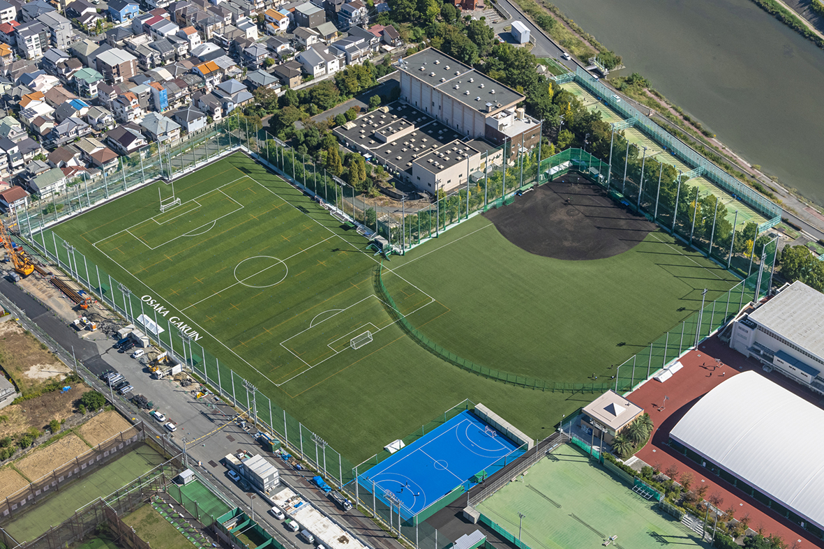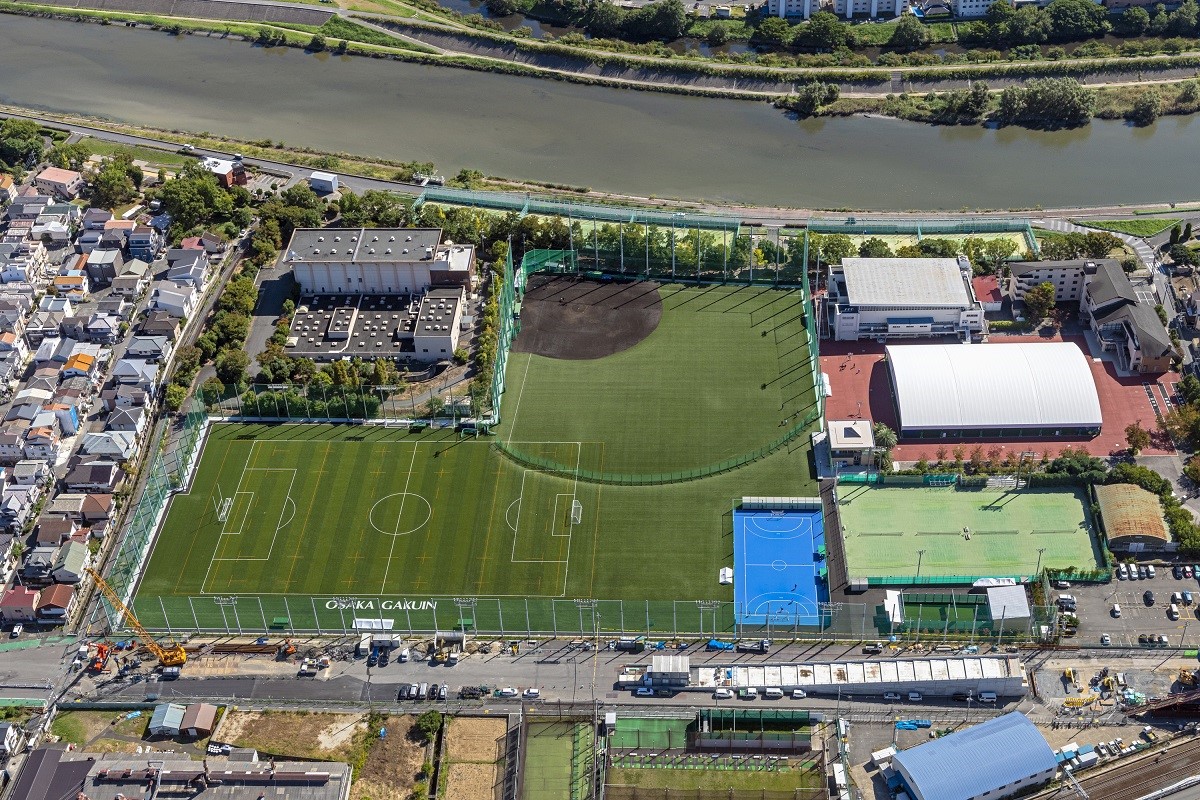 吹田市にある学校法人大阪学院大学の総合スポーツフィールドは、阪急京都線「正雀」駅から近く安威川沿いの開放的なグラウンドです。全フィールドにLED照明が完備され、次世代教育の場として注目されています。