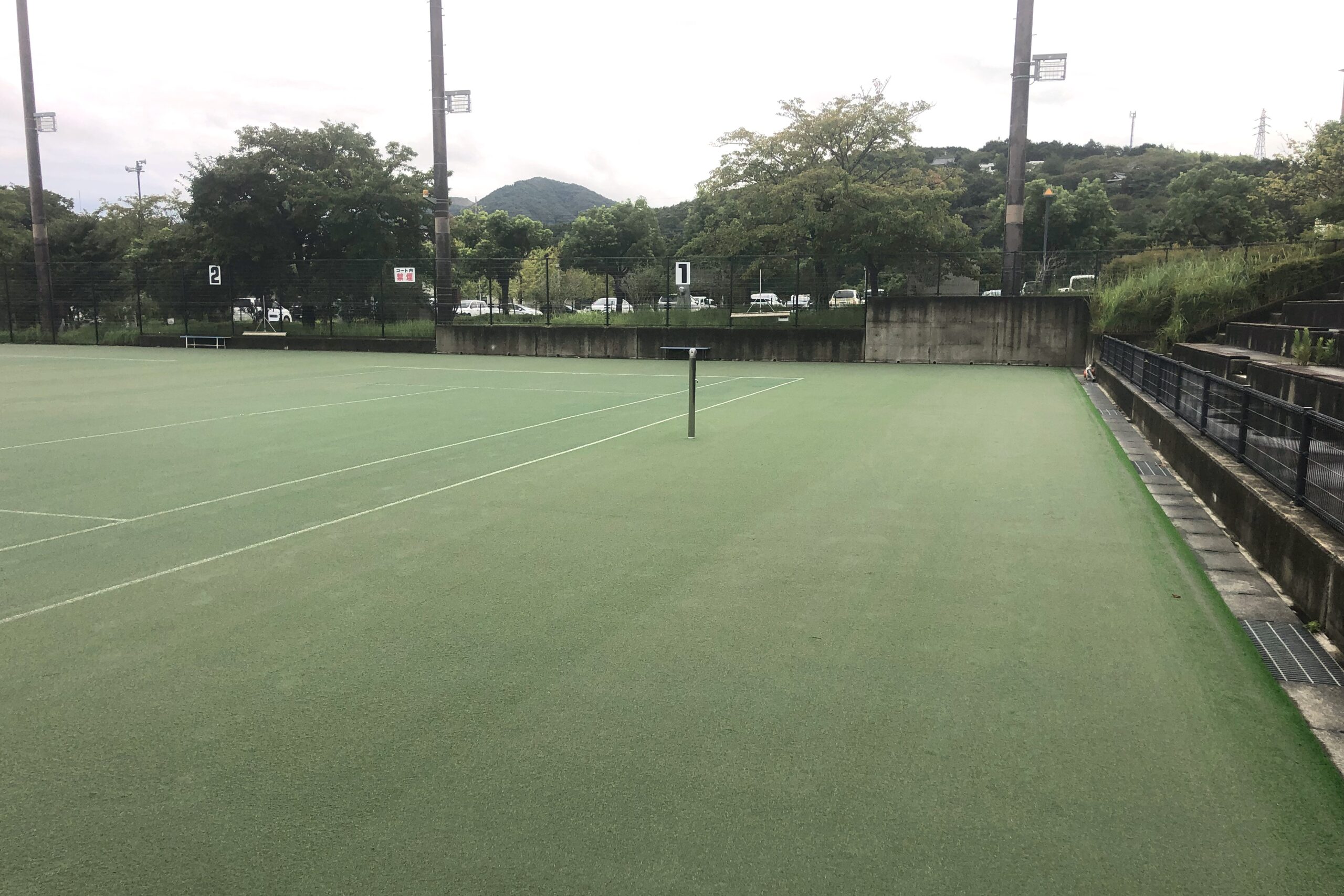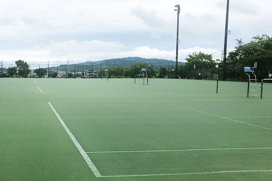 茨城県の桜川市総合運動公園の中にある砂入り人工芝舗装のテニスコートです。公園は軟式野球場やサッカーグラウンド、体育館などの施設が整備されています。テニスコートは計7面あり、その内の照明完備されている4面を改修する施工を担当しました。