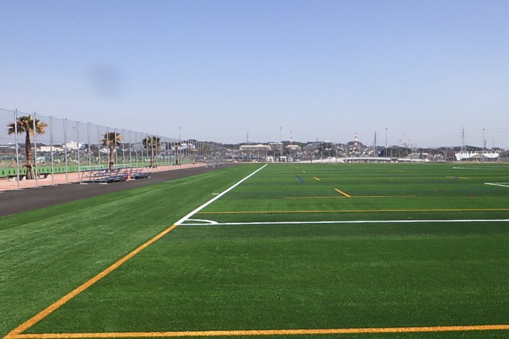 クッション性に優れたアンダーパット付きのロングパイル人工芝を使用しグラウンドを新設。グリーンの濃淡によるツートンカラーのグラウンドとコートサイドには、ブルーの芝でウォーミングアップゾーンが設けられ、サッカーやラグビー・アメリカンフットボール、8人制サッカーコートがレイアウトされている。
