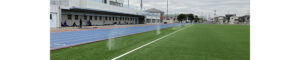 グラウンド舗装に黒土混合土を使用。また、貯留浸透の排水設計によって、水はけのよいグラウンドづくりに取組んだ。グラウンドに降った雨は、表面の排水勾配によって外周側溝に流水した水が集水桝に集まり、さらに、グラウンドに埋設されている貯留浸透型の暗渠トレンチによって地中へ浸透する。