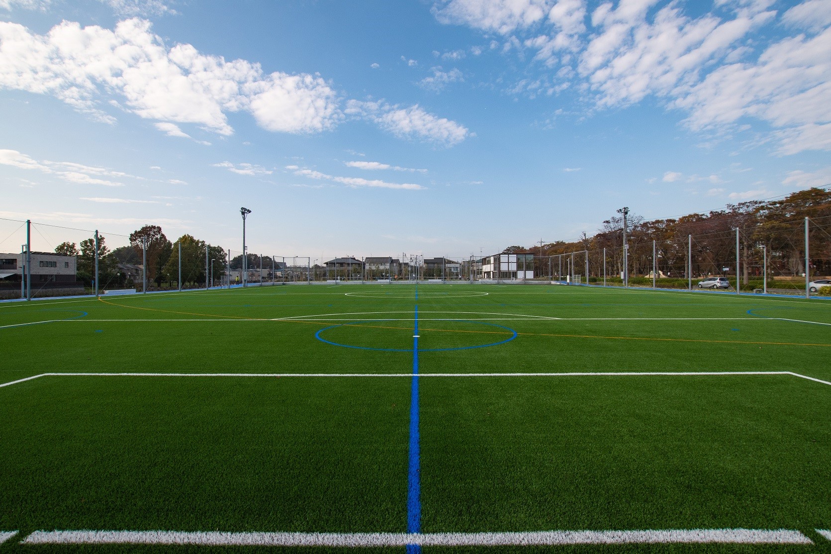 多目的グラウンドは、ロングパイル人工芝と、高さ6.2mの防球ネットを整備。グラウンドには、サッカーとフットサル、少年野球の施設を整備しました。