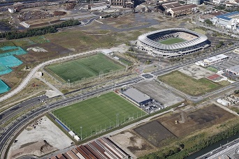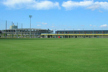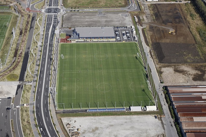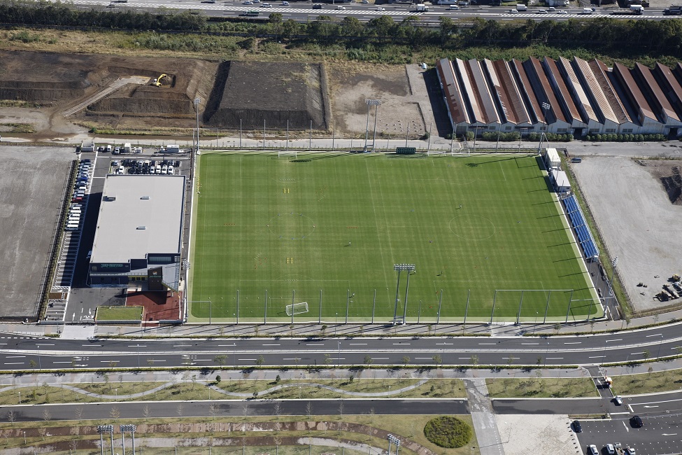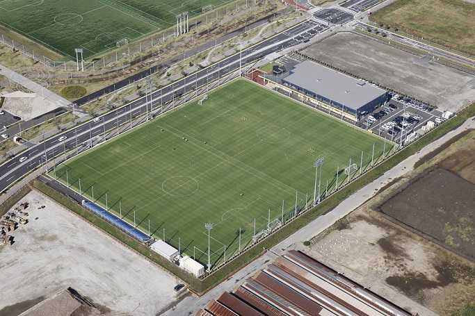 約16,400㎡の天然芝フィールドには、サッカーコート2面を配置することが可能で、夜間照明や観客席、芝生を維持していくための散水施設も整備され、クラブハウス内にはオフィシャルショップもオープン。スポーツターフ維持管理を担当。