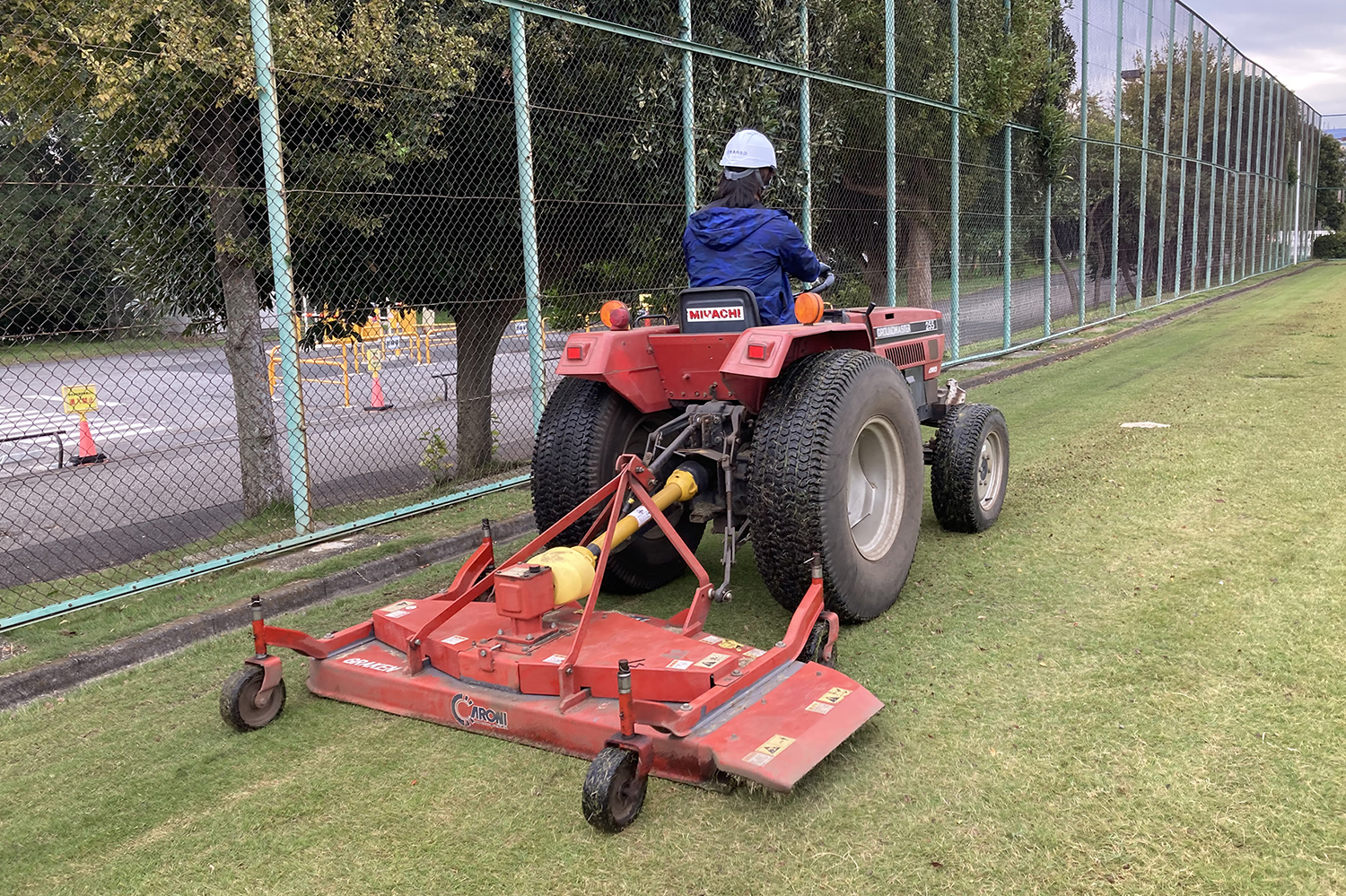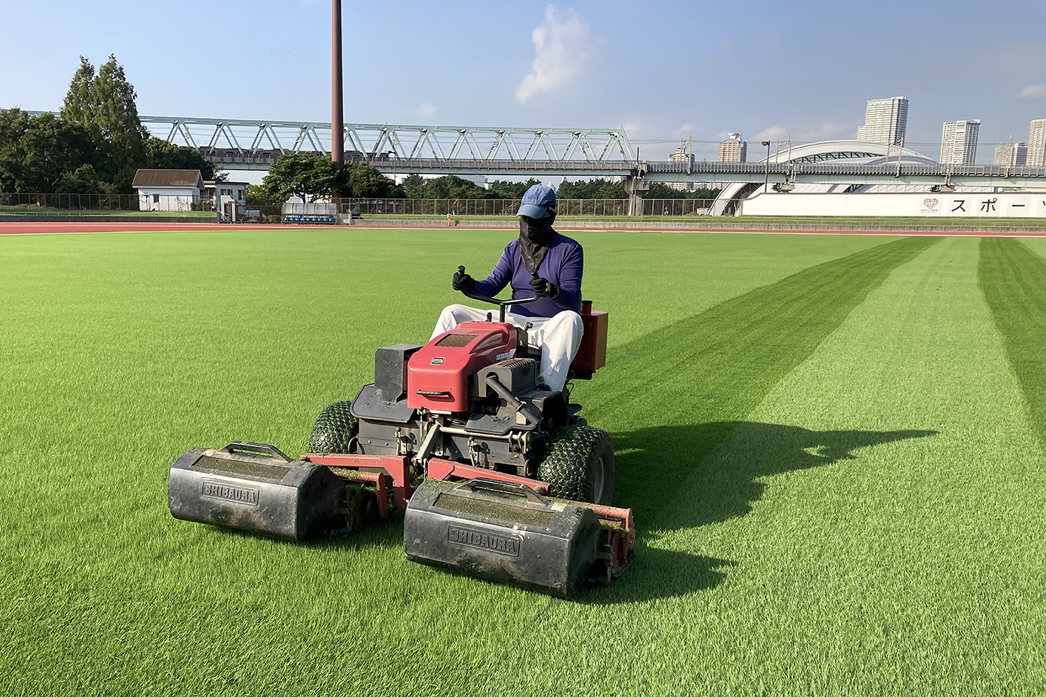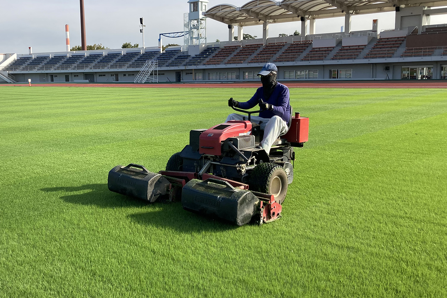 陸上競技場は、プロスポーツをはじめ地域小学校のイベントでも使用されるため、スポーツ振興・普及に貢献するべく、安全なグラウンドの提供を心がけています。特に、インフィールドの芝生は安全性と耐久性を兼ね備えた質の高い状態を維持するため、『スポーツターフ管理』のノウハウを活かした管理を行っています。