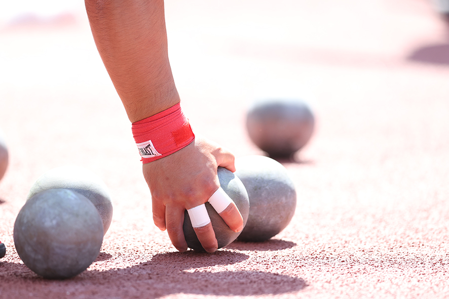 砲丸投の場合、テーピングは指先のみに巻く選手が多いです。最後は指にかかる負担が大きく、テーピングすると痛みが軽減されます。砲丸の重さが増えると手首に巻くこともあります。