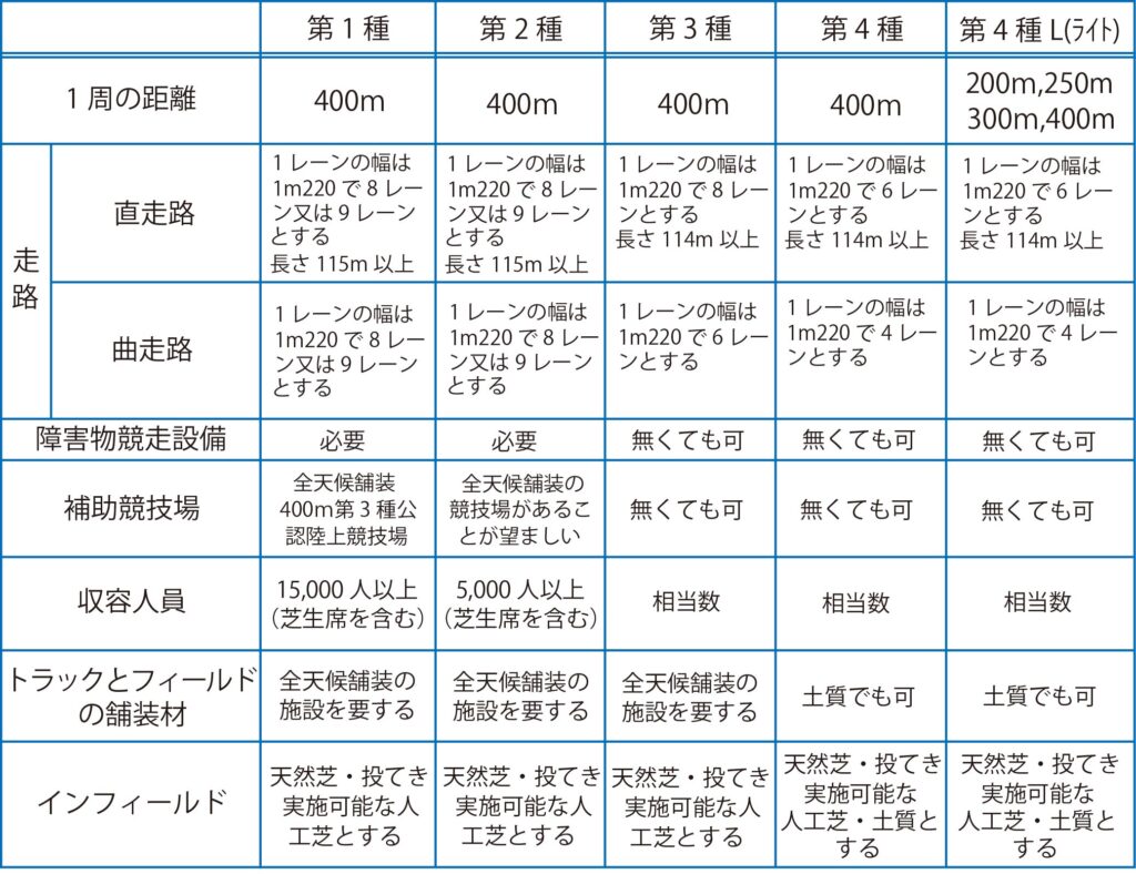 公認競技場は1種、2種、3種、4種・4種L(ライト)の5つの分類に分けられています。