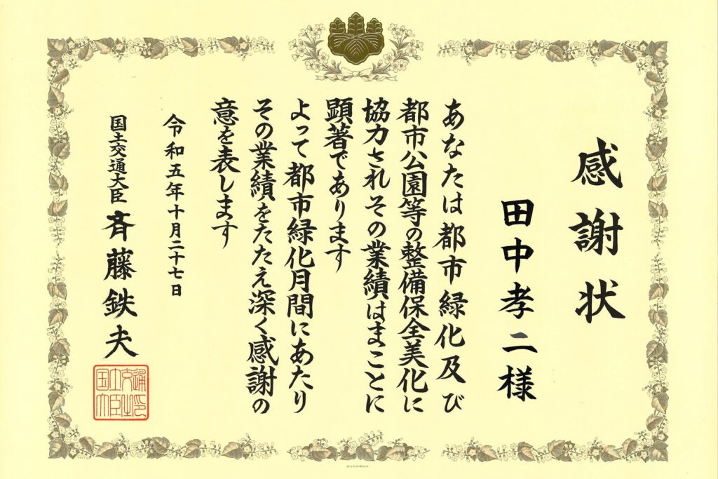 令和5年度の都市緑化月間(10月1日~31日)に際し、都市における緑化の推進、緑地の保全、都市公園の整備等に顕著な功績があった民間団体又は個人に贈られる「都市緑化功労者」国土交通大臣表彰が行われ、専務取締役の田中孝二が表彰されました。