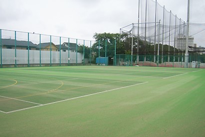 グラウンドに隣接する多目的コートは、テニスコート3面とハンドボールコート1面の兼用コートで、透水性砂入り人工芝舗装です。また、走幅跳用の助走路は、耐久性とクッション性に優れたゴムチップウレタン舗装(『レオタンαエンボス』Rタイプ)で、陸上用スパイクの利用が可能です。
