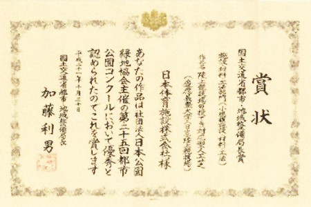 弊社が開発した投てき実施可能な人工芝『スポーツターフΛ(ラムダ)』が、平成21年度都市公園コンクール((社)日本公園緑地協会主催)で国土交通省都市・地域整備局長賞を拝受しました。