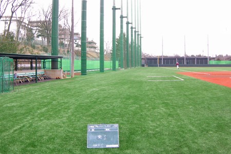 人工芝の整備と並行して、防球ネットも施工しました。場外への飛球を防ぐため、3塁側に高さ40mの防球ネットが設置されました。