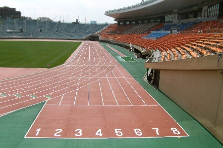 国立霞ヶ丘競技場は、1991年世界陸上東京大会開催のため、その前年に『レオタンαエンボス』(ローラーエンボス仕上げ)に改修されました。