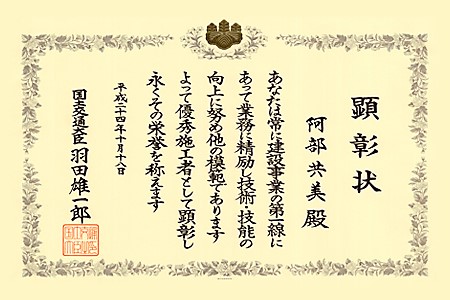 建設現場において工事施工に直接従事し、現役として活躍している建設技能者のうち、特に技能・技術及び人格に優れ、後進の指導・育成により「建設」の質の維持向上に貢献をしている技能者に贈られる『優秀施工者国土交通大臣顕彰』を、当社の施工管理グループのリーダー阿部共美が受賞しました。