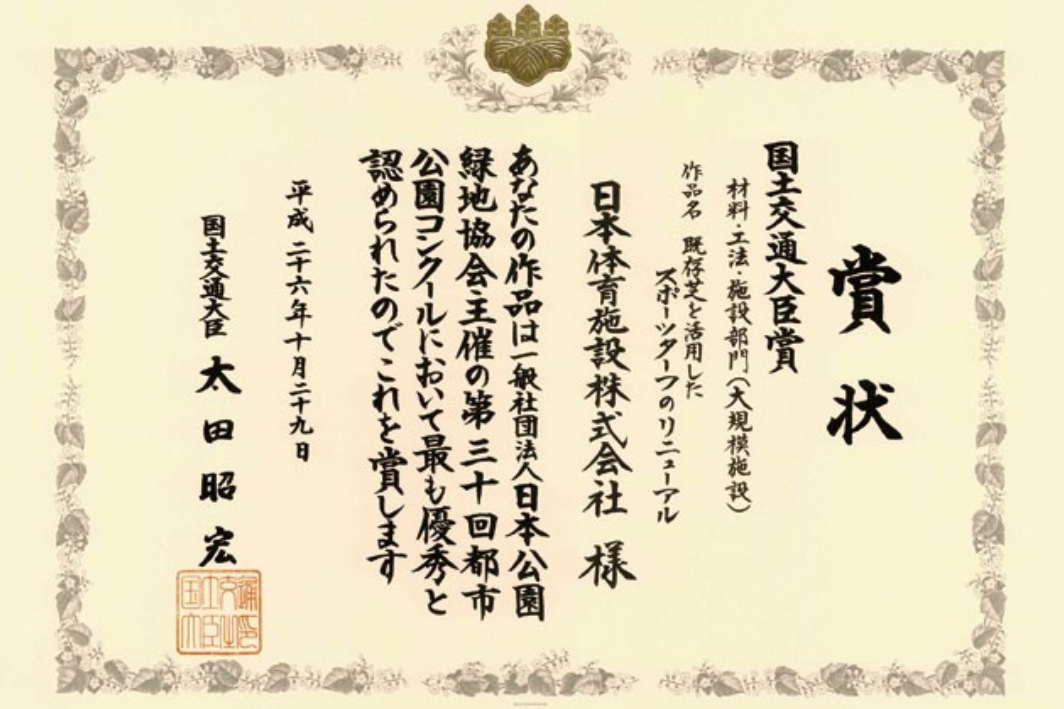 町田市立野津田公園内にある町田市立陸上競技場で施工した「既存芝を活用したスポーツターフリニューアル工法」が、第30回都市公園コンクール[材料・工法・施設(大規模施設)部門]において、国土交通大臣賞を受賞しました。