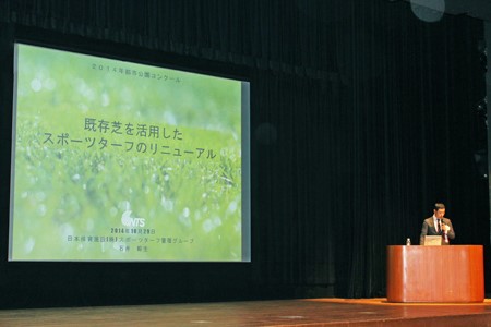 表彰式の後、当社スポーツターフ管理グループ職員が「既存芝を活用したスポーツターフリニューアル工法」について報告を行いました。
