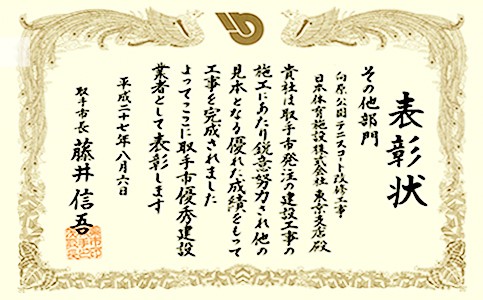 工事の質が高いだけでなく、苦情なく工程通りに改修を終えられたことなどが総合的に評価され、取手市優秀建設業者として表彰していただきました。