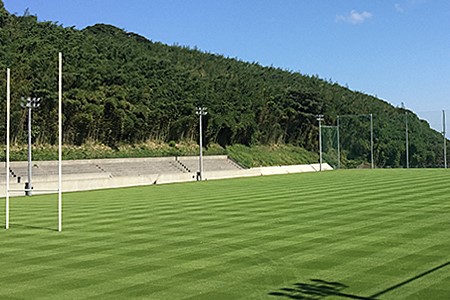 別府市の実相寺多目的グラウンド整備工事が完成し、天然芝舗装のグラウンドにリニューアルされました。