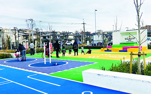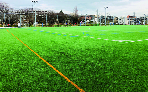 テニスコートは天候に左右されない砂入り人工芝舗装、サッカーとフットサル、少年野球施設を備えたグラウンドにはロングパイル人工芝舗装が整備されました。グラウンドの外周走路と遊具の下に使用されている舗装材は、従来のチップより強度の高いTPVチップを使用した高強度カラーチップ舗装です。