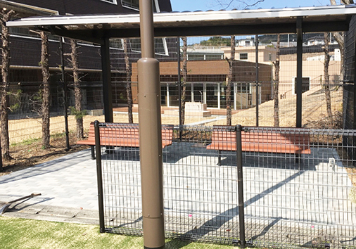 さらに今回工事では、休息や交流に利用できる施設として、コートサイドに日よけスペースとしてキャノピーやベンチを設置し、周囲はインターロッキング舗装を施工しました。