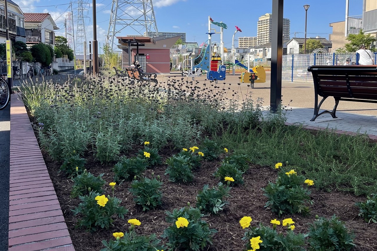 遊具エリアの周りには、ハーブ類や花の咲く一年草など季節の変わり目を演出する植物を配置しています。ローズガーデン同様四季折々の風景を皆様にお届けするべく、いつ来てもお楽しみいただけるよう、除草・水やりなどの日常の植栽維持管理を工夫して行っています。