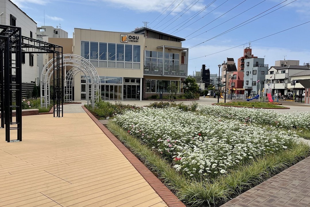 公園は4つのガーデンが広がり、入口付近には「荒川区立尾久図書館」、その正面には子ども広場があります。また、スポーツエリアとしてテニスコート、その北側には防災設備が整備された多目的広場があり、総面積約2.3haの中に4つのコンセプト、文化創造・子育て教育・生涯健康・安全安心に基づいて整備された公園です。また、2022年7月5日より尾久図書館内飲食スペースに日本体育施設と共同で日暮里にある人気のパン屋「ひぐらしベーカリー」の2号店を出店しました。