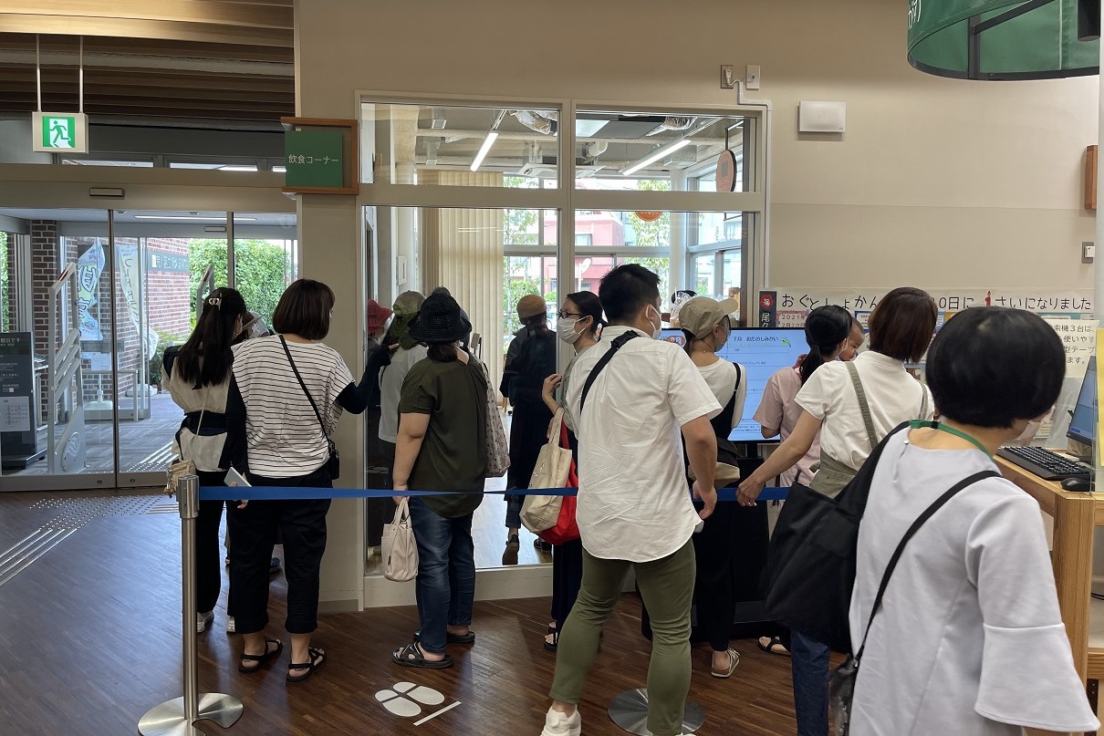 オープン初日から購入待ちの列ができ、お昼過ぎにはパン類が売り切れてしまうほど好評いただいております。限定の「あらかわ薔薇のパン」をはじめ、パン以外にも、焼き菓子やコーヒーなどの各種ソフトドリンクやソフトクリームも販売しているので、図書館外デッキや公園内に持ち込んでくつろぐこともできるようになっています。