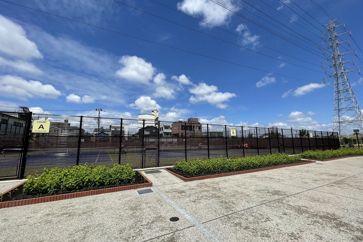 テニスコートは園内の中央部付近に整備されており、周りにはシェアサイクルや公園管理事務所があります。