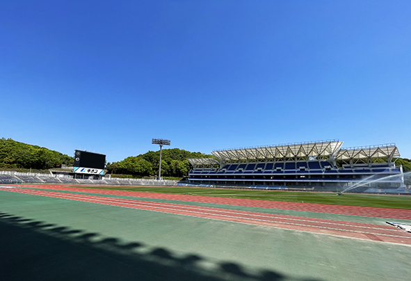 東京都町田市野津田公園内にある「町田GIONスタジアム」は、東京都町田市をホームタウンとするFC町田ゼルビアのホームスタジアムであり、「レオタンαエンボス」の全天候ウレタントラックと天然芝フィールドを備えた第三種公認陸上競技場です。日本体育施設は、指定管理者として2009年から芝生管理に携わっています。