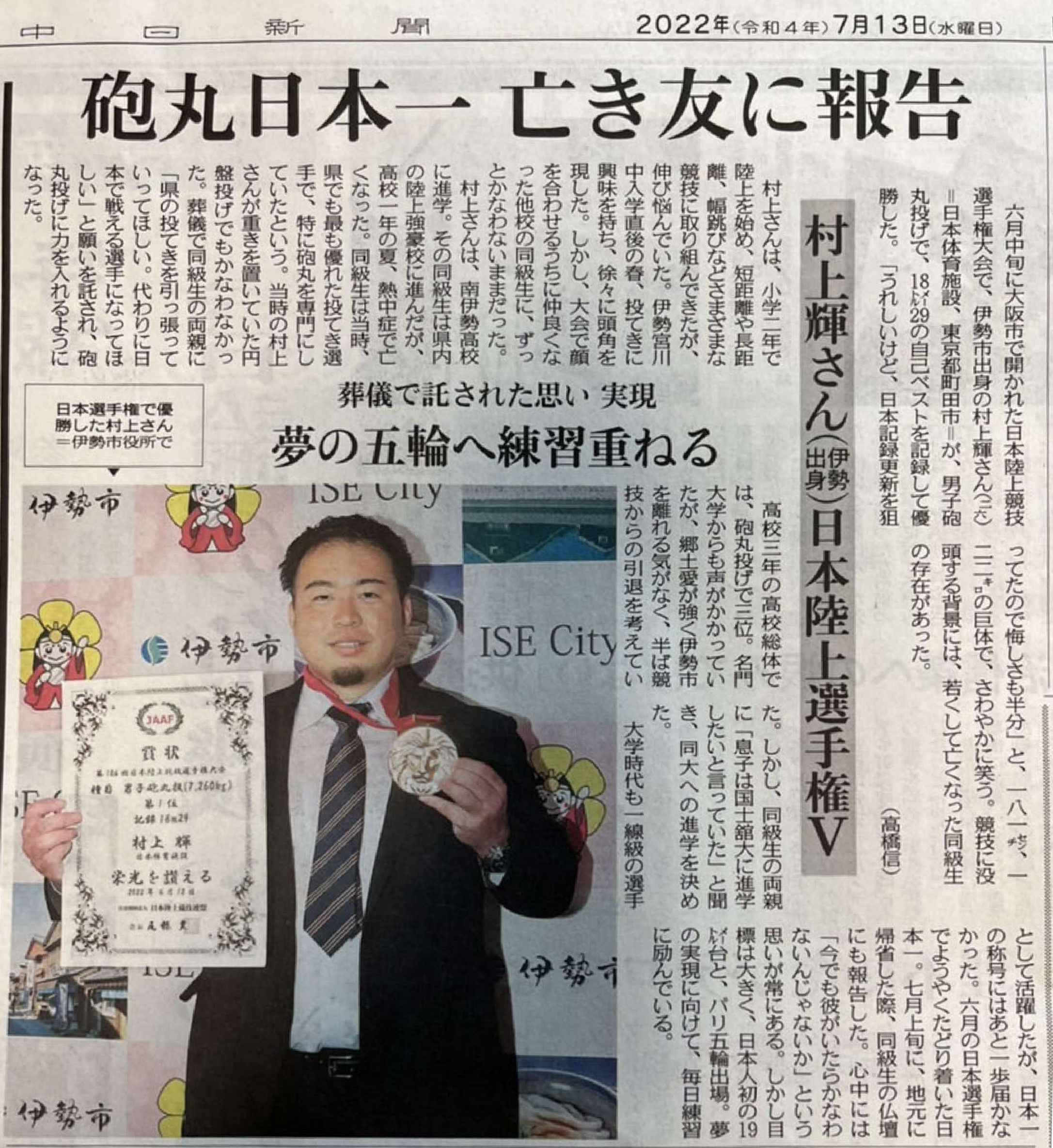 2022年7月11日、当社所属の村上輝選手(伊勢宮川中出身)が自身の故郷である伊勢市役所で鈴木健一市長を表敬訪問し、第106回日本陸上競技選手権大会の優勝を報告致しました。村上輝選手は、第106回日本陸上競技選手権大会の男子砲丸投へ出場し、自己ベストの18メートル29の記録で初優勝しました。