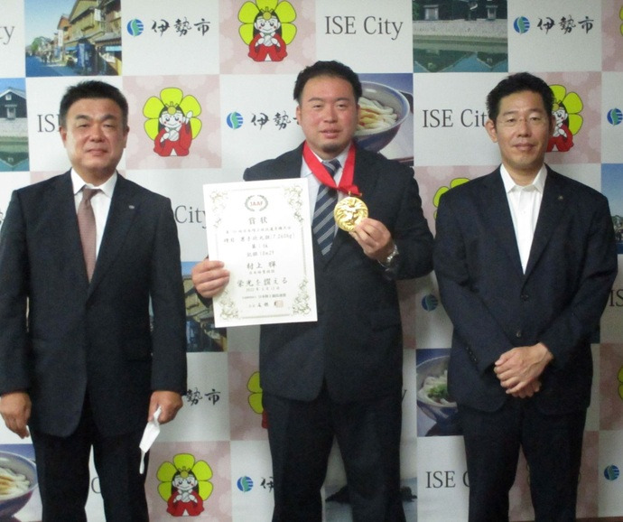 右:鈴木市長、中央:村上選手、左:中部営業所米持所長