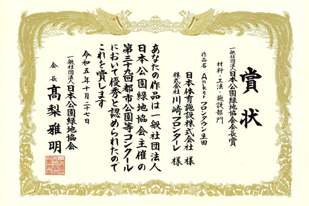 当社がグラウンドを施工した「Anker フロンタウン生田」が、令和5年度第39回都市公園等コンクールの材料・工法・施設部門において(一社)日本公園緑地協会会長賞を受賞しました。マイクロプラスチック流出抑制や夏季の暑熱環境緩和など、安心、安全で快適なスポーツ環境を追求した施設の整備が評価されました。コンクールには、株式会社川崎フロンターレ様と当社の連名で応募しました。