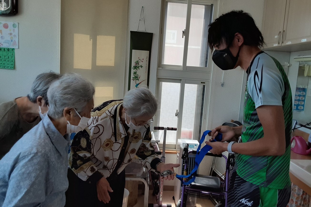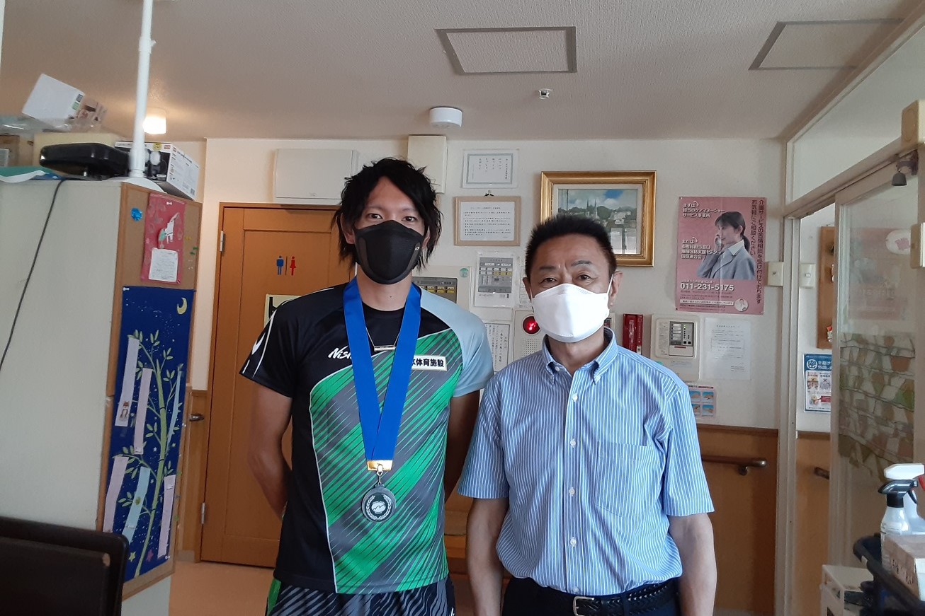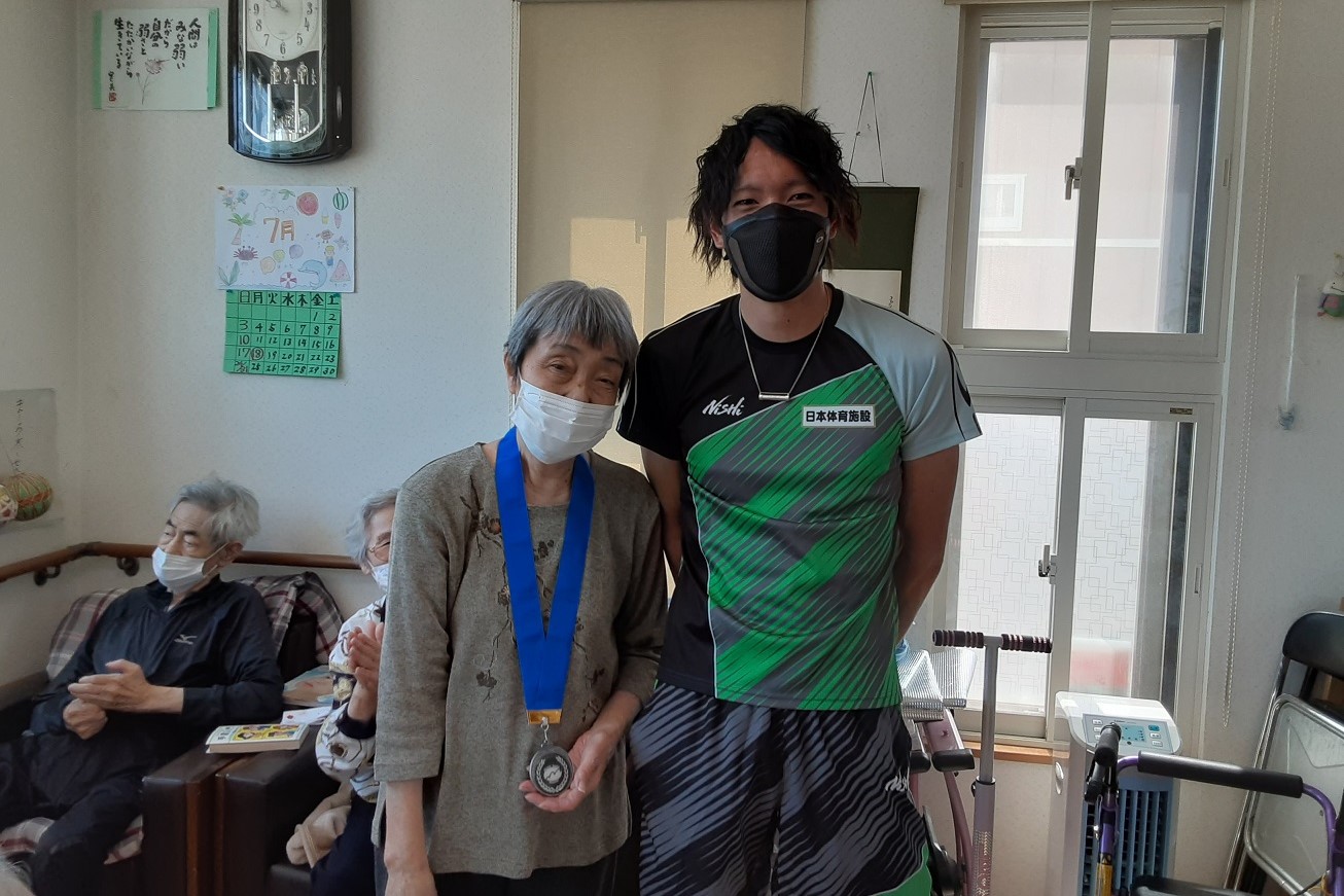 日本グランプリシリーズ札幌大会 第35回南部忠平記念陸上競技大会の2位入賞を報告するとともに、入居者様と交流しました。入居者の皆様は、はじめは緊張されていましたが、大田和宏選手と話をしているうちに笑顔が見えるようになり、メダルに触るなど和やかな時間を過ごされていました。
